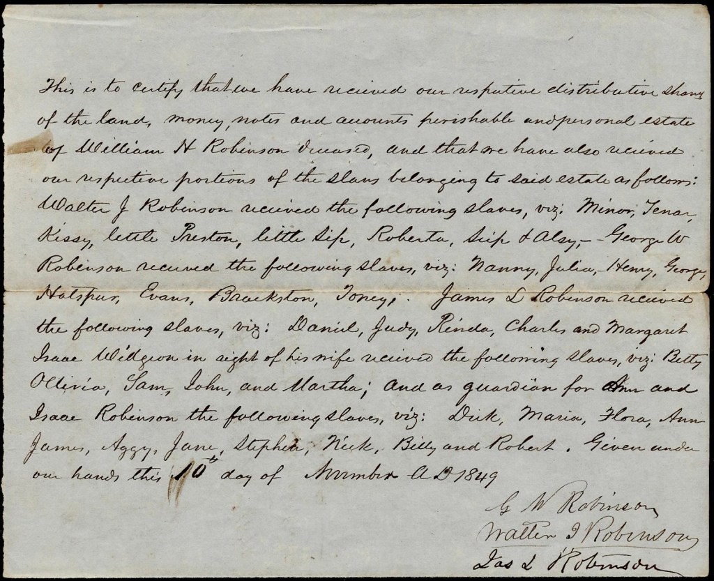 This is to certify that we have received our respective distribution shares of the land, money, notes and amounts perishable and personal estate of William H. Robinson, deceased, and that we have also received our respective portions of the slaves belonging to said estate as follows:
