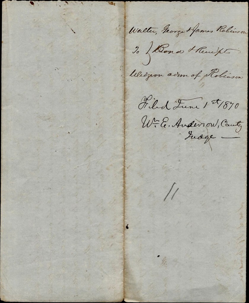 The following document certifies the satisfactory division and disposition of property associated with the estate of William H. Robinson, probably a brother of Jacob Robinson (1779-1840) who resided in Marianna, Jackson county, Florida. The property included 36 slaves that were distributed to the children of Jacob Robinson which included Walter Jacob Robinson (b. 1820 and who would later serve as Capt. of Co. E, 2nd Florida Infantry), George W. Robinson (b. 1825), James L. Robinson (1826-1875), and to Hettie Isabelle Robinson (b. 1816). Actually Hettie’s slaves became the property of her husband, Isaac Widgeon (b. 1810) who also served as administrator of the will. Isaac also took ownership of slaves willed to two juveniles.
