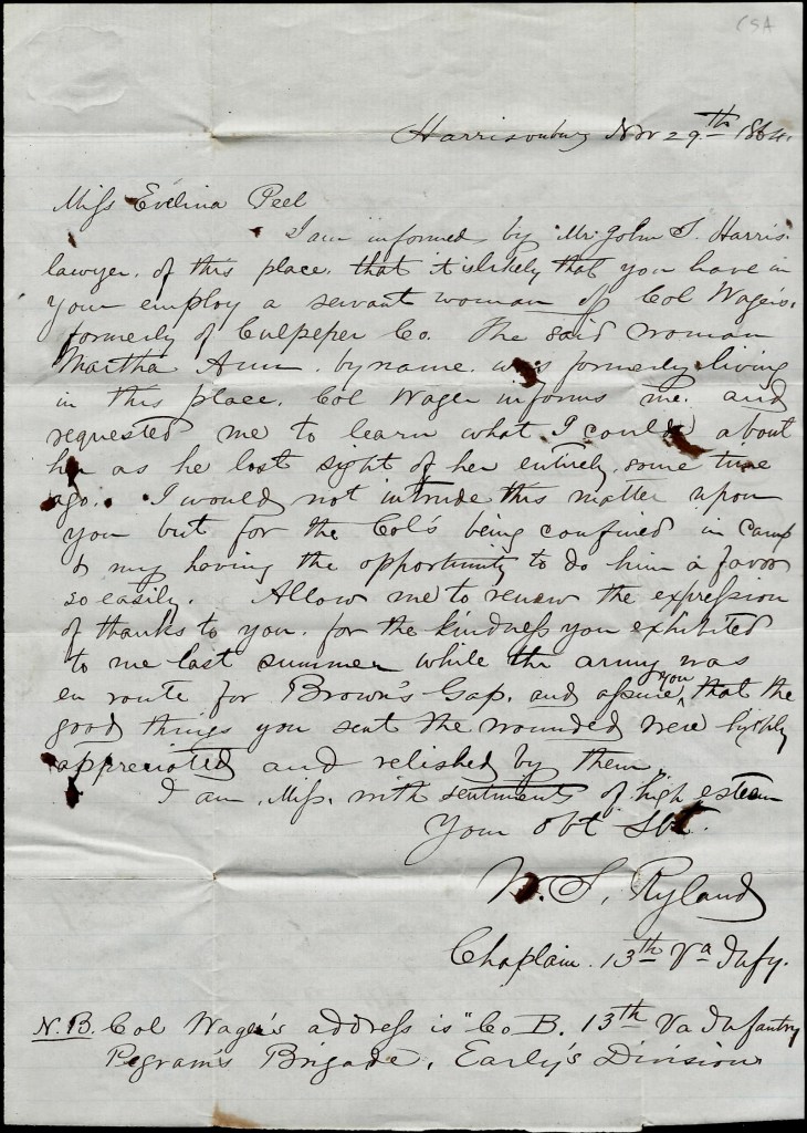 I am informed by Mr. John T. Harris, lawyer of this place, that it is likely that you have in your employ a servant woman of Col. Wager’s, formerly of Culpeper county. The said woman, Martha Ann by name, was formerly living in this place, Col. Wager informs me, and requested me to learn what I could about her as he lost sight of her entirely some time ago. I would not intrude this matter upon you but for the Colonel’s being confined in camp & my having the opportunity to do him a favor so easily. Allow me to renew the expression of thanks to you for the kindness you exhibited to me last summer while the army was en route for Brown’s Gap and assure you that the good things you sent the wounded were highly appreciated and relished by them.