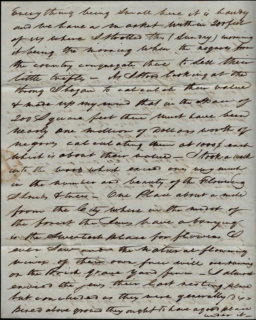 Saturday very late in the evening we had an awful tornado which has injured our crops very much, particularly your large corn. The cotton, I hope, will all straighten up soon. The wind blew down very many trees in the Plantation. On Saturday night, we had a very heavy rain. Another on Sunday during the day and it has been raining very hard all the morning up to 9 o’clock. The quantity of rain fallen has been immense, rendering it impossible to plow in old grounds for a day or so. All your plows are in the new ground nearest to my gin. On examining your new ground the day after you started (which was the 13th) I found three [cotton] blossoms. We have now a great many but they are not fully blown, which is attributed to the last few days having been very cloudy. One or two days sun will show a great many.