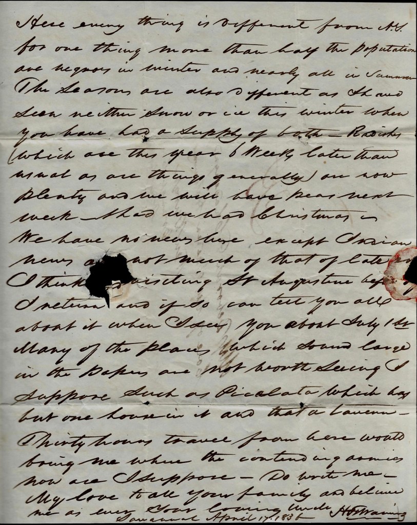 This letter will be dropped at Line Port by the Steamer Talleyrand. I will leave it open until she arrives. Your negroes (except Harick) are all well, but showing considerable disposition to lay up, or in other words, to possum.