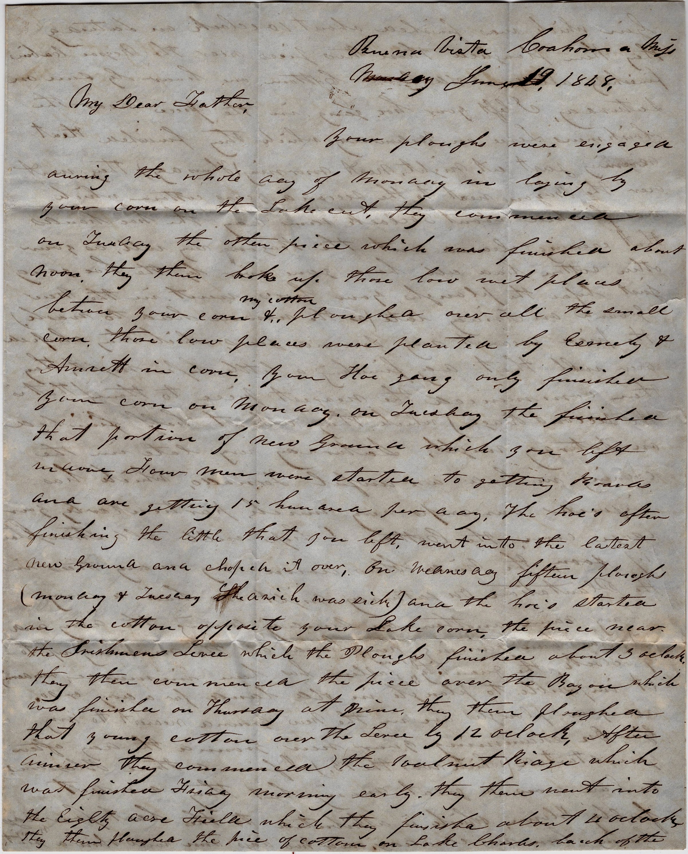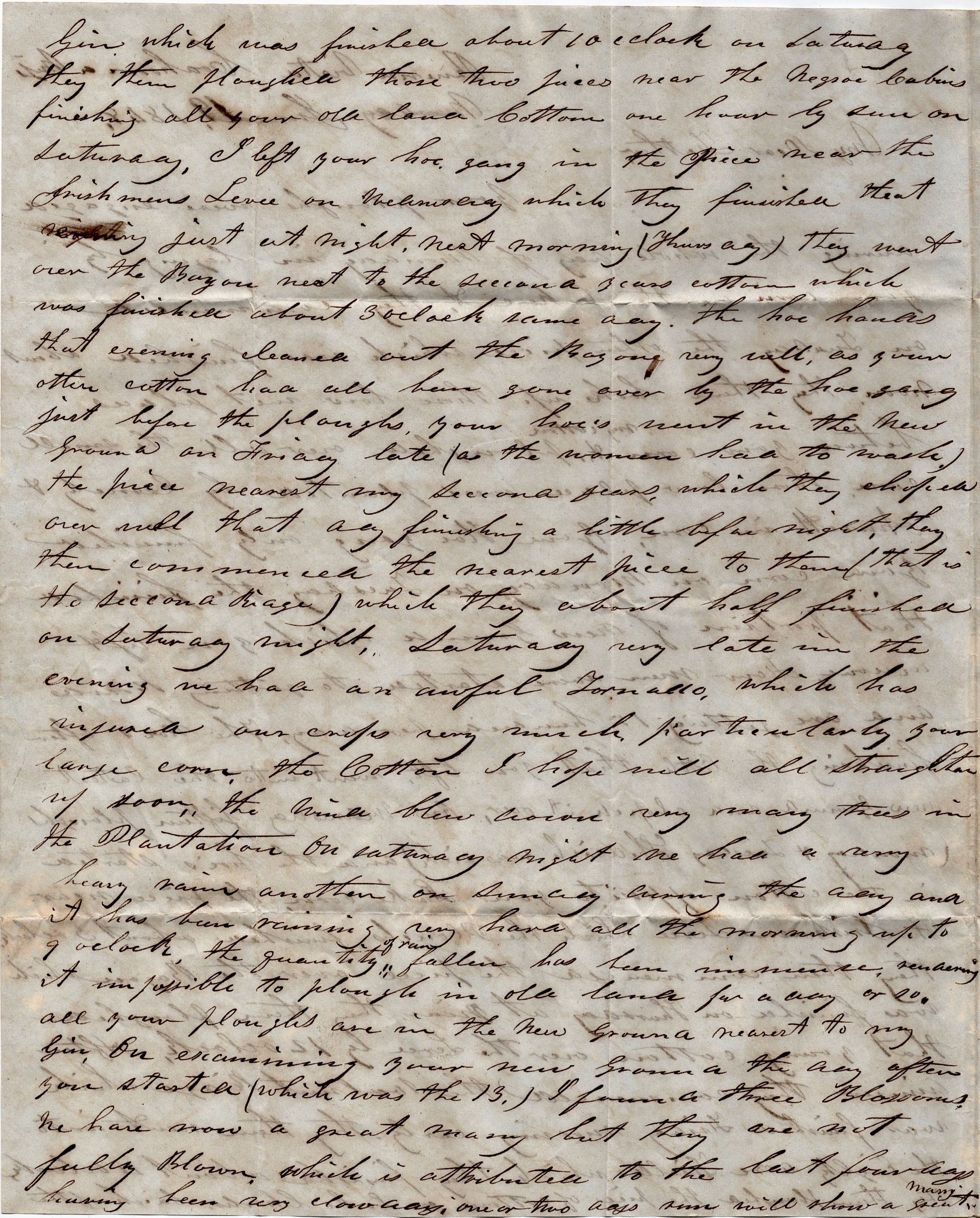 On Wednesday fifteen plows (Monday & Tuesday Harich [?] was sick) and the hoe’s started in the cotton opposite your lake corn—the piece near the Irishmen’s levee—which the plows finished about 3 o’clock. They then commenced the piece over the Bayou which was finished on Thursday at nine. They then plowed that young cotton over the levee by 12 o’clock. After dinner they commenced the Walnut Ridge which was finished Friday morning early. They then went into the eighty acre field which they finished about 4 o’clock. They then plowed the piece of cotton on Lake Charles, back of the gin which was finished about 10 o’clock on Saturday. They then plowed those two pieces near the negro cabins, finishing all your old land cotton one hour by sun on Saturday.