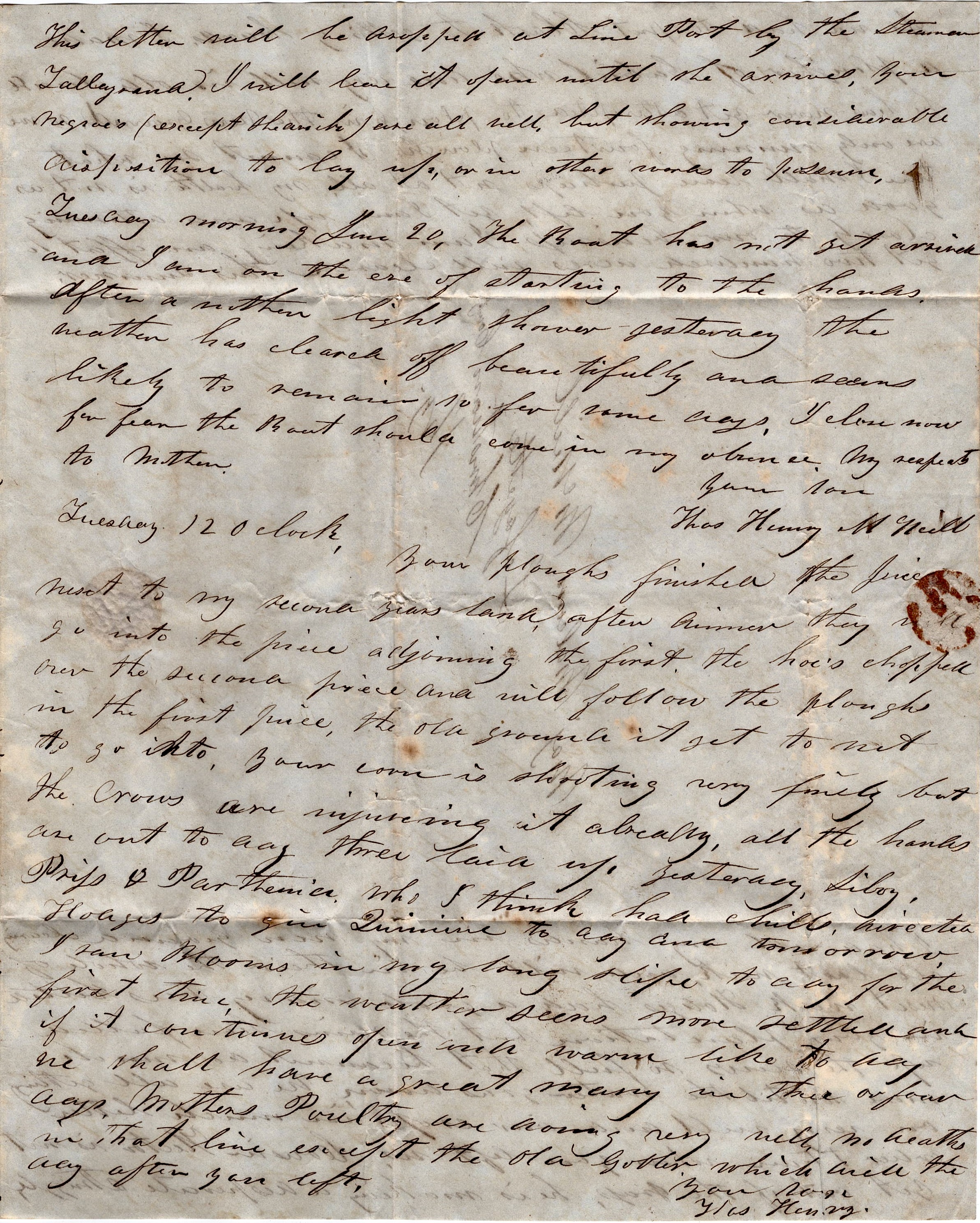 Tuesday 12 o’clock. Your plows finished the field next to my second year’s land. After dinner they will go into the piece adjoining the first. The hoe’s chopped over the second piece. The old ground is yet too wet to go into. Your corn is shooting very finely but the crows are injuring it already. All the hands are out today. Three laid up yesterday—Libby, Priss and Parthenia—who I think had chills. Directed Hoages to give quinine today and tomorrow. I saw blooms in my long [ ] today for the first time. The weather seems more settled and we shall have a great many in three or four days. Mother’s poultry are doing very well. No deaths in that line except the old gobbler which died the day after you left. Your son, — Thos. Henry