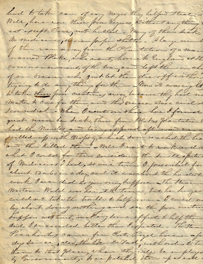 Well, here were these poor negroes without anything to eat except rice, nut hulled. Many of them sick. No medicine or even proper shelter. A large number of them ran away from the plantation of a man named Blake who went home to England at the commencement of the war and left them in charge of an overseer who just let them die off without trying to do anything for them. Now it was right to take these poor creatures away, because they had no master to care for them, and the overseer was a cruel old scoundrel. 2