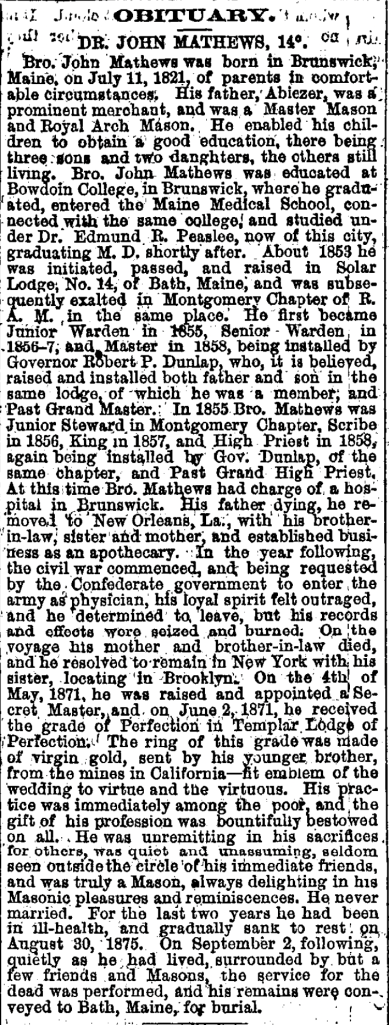 John enlisted in the U. S. Navy in 1861. He reported to the USS E.B. Hale as Assistant Surgeon. He was transferred to the US Bark Gem of the Sea in October 1861, and joined the South Atlantic Blockading Squadron off the South Carolina coast. She ran British blockade runner Prince of Wales aground off Georgetown 24 December. She captured blockade runner Fair Play 12 March 1862, schooner Dixie 15 April 1862, and schooner Mary Stewart 3 June. Nine days later she took schooner Seabrook off Alligator Creek. On 1 July she took possession of four rice-laden lighters up the Waccamaw River. Mathews was discharged on 18 September 1863 due to rheumatism. After hhe war, Mathews settled in Brooklyn, New York, where he practiced medicine. His residence was at 239 Fifth Avenue at the corner of Carroll Street. He died in 1875 and was buried in Bath, Maine.
