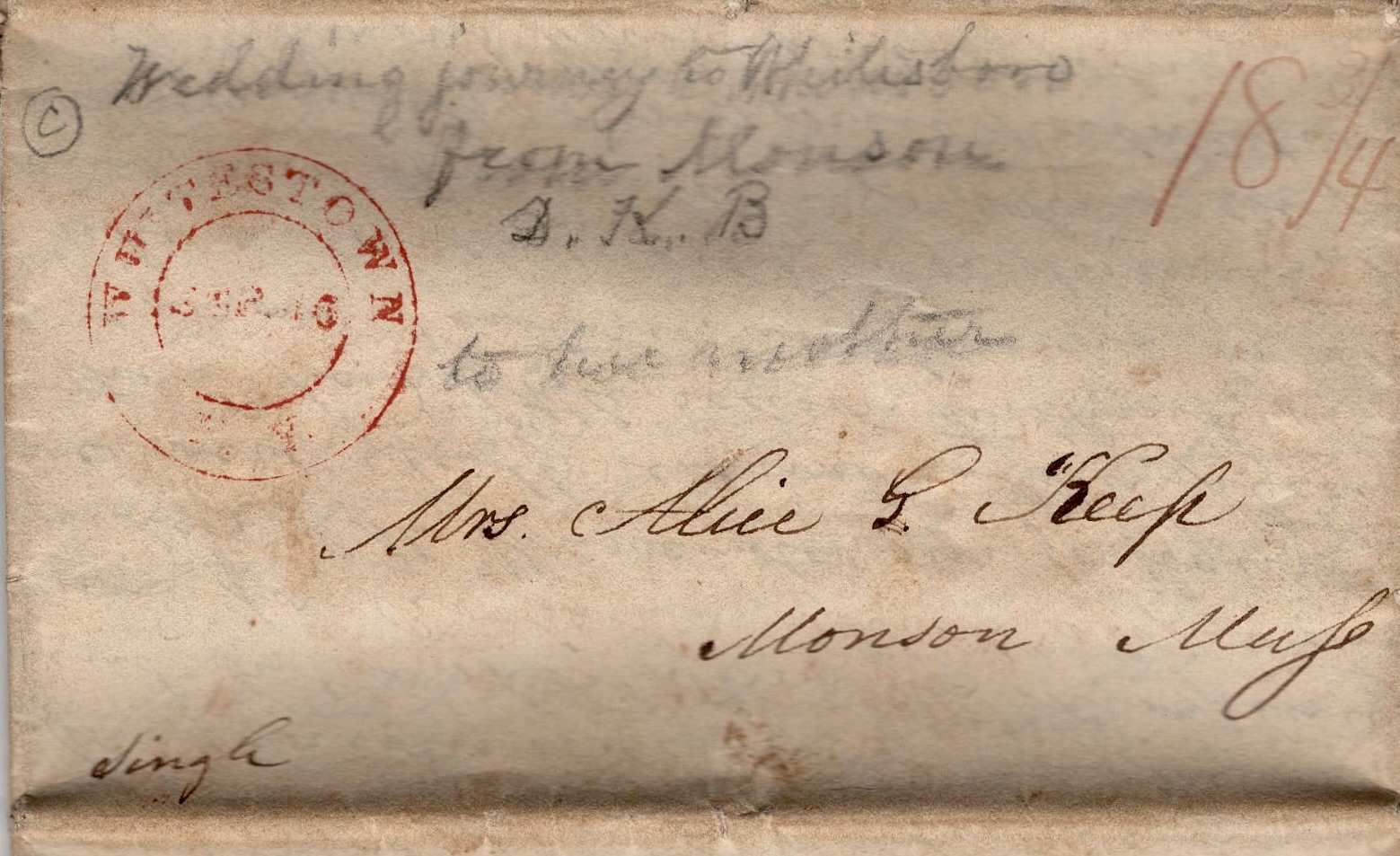 Diantha (Keep) Blodgett (1807-1884) was 22 years old and just two weeks married when she wrote this letter to her mother, Alice (Goodall) Keep, wife of Simeon Keep of Monson, Massachusetts. Her new husband, Harvey Blodgett (1802-1850), was an 1829 graduate of Amherst College and we learn he was employed teaching school at Whitesboro. He may have been teaching at the Oneida Institute which was a short-lived Presbyterian school in that village, and the first to accept both Black and White students in the United States. His first appointment to the ministry in the Presbytery was at Euclid (East Cleveland, OH) in 1837. After a few years he left the ministry and returned to teaching at Newton Falls, Ohio, and later at Jackson, Illinois, where he died of typhoid fever in 1850. The couple had several children, one of who was James Harvey Blodgett (1832-1916) who was Captain of Co. E, 75th Illinois Infantry during the Civil War.