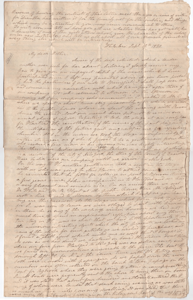 Diantha’s letter gives us a glimpse of what travel was like in 1830 in New England. Her journey from her birthplace in Monson, Massachusetts, to her new home in Whitesboro, New York, takes us on two stage rides, two steamboats, and two boats on the Erie Canal—a journey she claimed was 450 miles.
