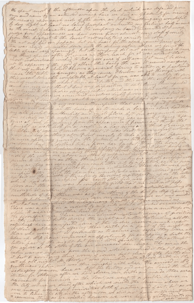 We not only had our passage but our board for the above named price. When tea was ready, we rushed down into the dining room where we found the table spread very sparingly, but the company did not seem disposed to have anything spared after it came in their reach, for it was evident that most individuals wished to take good care of self even if it must be done at the expense of the good of others. This being the case, it seemed necessary that self interest should become a general spring to action or a part would leave the table as hungry as they came. However, we got through with this meal tolerable comfortable, at least for one was able to satisfy the demands of nature with weather bread and butter, and this was the only article which came in my way that I had any disposition to eat. Being this refreshed, we returned to the ladies sleeping cabin which was crowded with women and children. Here we considered ourselves highly favored if we could find a place to sit down. I soon went to my basket which I had left in one of the berths and found to my no small surprise that someone fond of trade and so well skilled in the business as to make a bargain alone had taken my silk pocket handkerchief and it its place left one very much worn and so dirty as to be unfit for use. This discovery was somewhat trying to patience at first, but judging from the appearance of persons and things that I might as well look for a needle in a hay mow as to think of seeing my handkerchief again. I concluded that it was best to give myself no uneasiness and say nothing about it, but merely to take a practical lesson and be more upon my guard for the future. I was told that another lady on board had ten dollars taken from her basket.