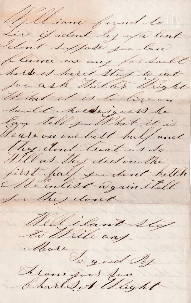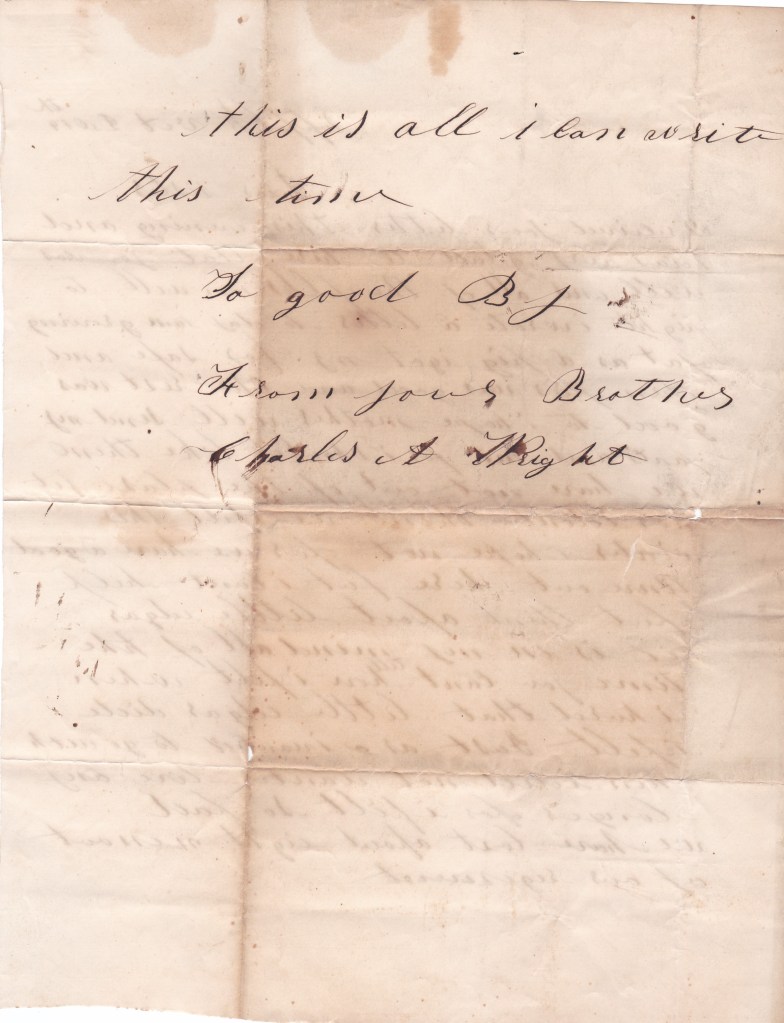 I received a letter from Bro. William last night. Will answer it in a day or two. We were paid off last Saturday and I will send you the money either by R[ussell] M. Brown tomorrow or in a letter in a few days. Russel M. Brown has got his discharge and is a going to start home tomorrow. He is very low and I doubt his standing his journey very well. He will call on you when he is able to and let you know just how I get along. A. K. [Amos K. Brown] is quite sick but will probably get up in a few days. We have quite a number of sick ones but none very dangerous as yet. I have had a few shakes of the ague. The doctor gave me quinine enough to break it up so I am all right. I will try and write you again in a few days but you need not wait for me to write but send along your letters and all the news. I will attend to Mercy as soon as it is convient. Bill Leaver’s & Dan Jennings’ wives are here and making about ten dollars apiece per week in baking, &c., for the soldiers. Dan’s wife is not very well for a [ ].