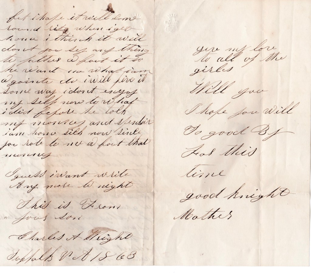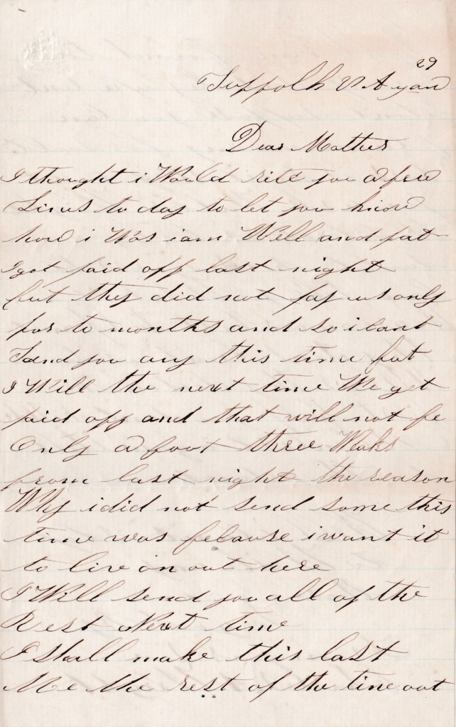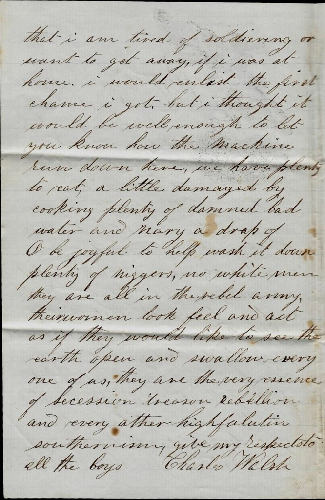 It is over one week since I wrote to you, but be assured you are not forgotten for I think of you as often as though I wrote every day. We have been moving our camp and making streets through our new city and I have had to get my three meals of victuals per day for the Captain and Lieutenants and often I have to cook for our sick boys. And when it comes night, you may guess that I am very tired. Tonight my legs and feet feel as though I had been on an all day march and now it is after nine o’clock in the evening, but write I will.