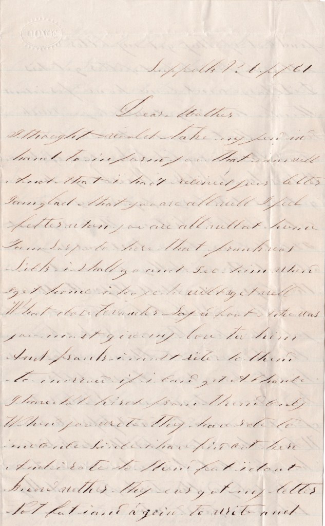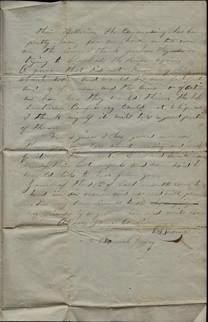 The 112th [New York] Regiment and a good many other regiments and cavalry and artillery went out last week Friday on a Black Water excursion and are still out there. Today we could hear considerable heavy firing in that direction, and I would not be surprised if they had some tall fighting.