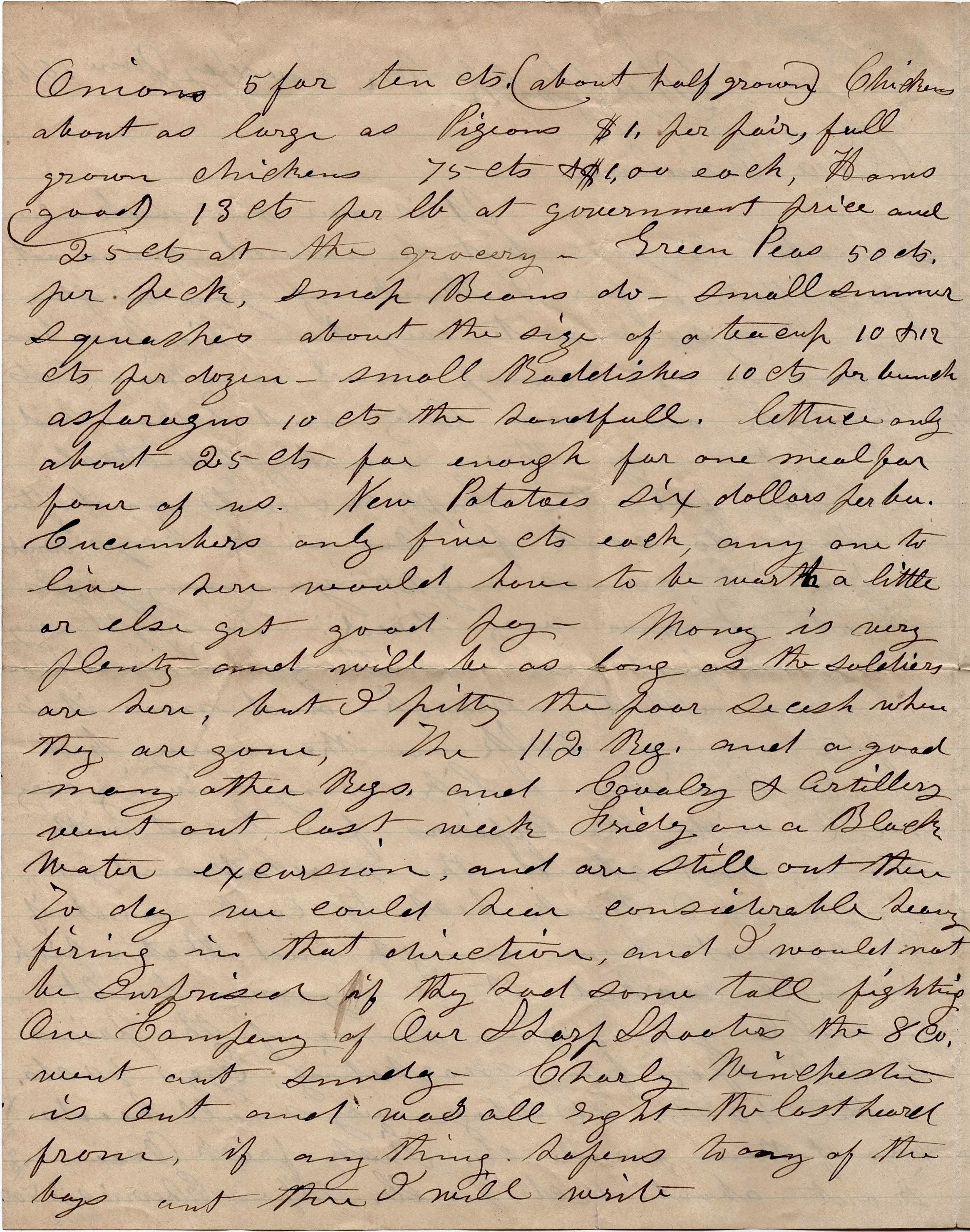 I like my living very well with the officers for I eat with them and attend the markets and get such as I think best to cook, and if I do not have enough and that which is well cooked, it is my own fault. I will give you some of the prices that I pay for marketing. Eggs 40 cents, butter 40 cents, cabbage, very small heads, two of them for 25 cents, fish, fresh ocean trout about 15 cents per lb., ripe cherries 25 cents per quart, onions 5 for ten cents (about half grown), chickens about as large as pigeons $1 per pair, full grown chickens 75 cents & $1 each. Hams (good) 13 cents per lb. at government price and 24 cents at the grocery. Green peas 50 cents per peck, snap beans ditto, small summer squashes about the size of a teacup 10 and 12 cents per dozen, small radishes 10 cents per bunch, asparagus 10 cents the handful. Lettuce only about 25 cents for enough for one meal for four of us. New potatoes six dollars per bushel. Cucumbers only five cents each. Anyone to live here would have to be worth a little or else get good pay. Money is very plenty and will be as long as the soldiers are here, but I pity the poor secesh when they are gone.