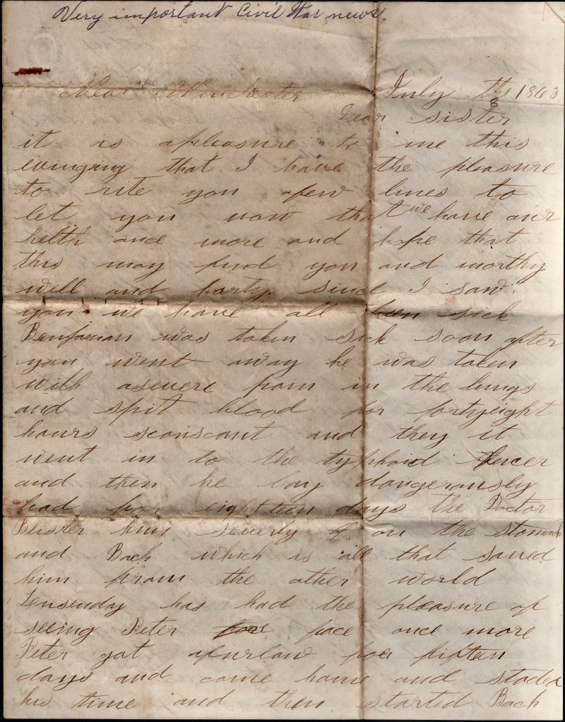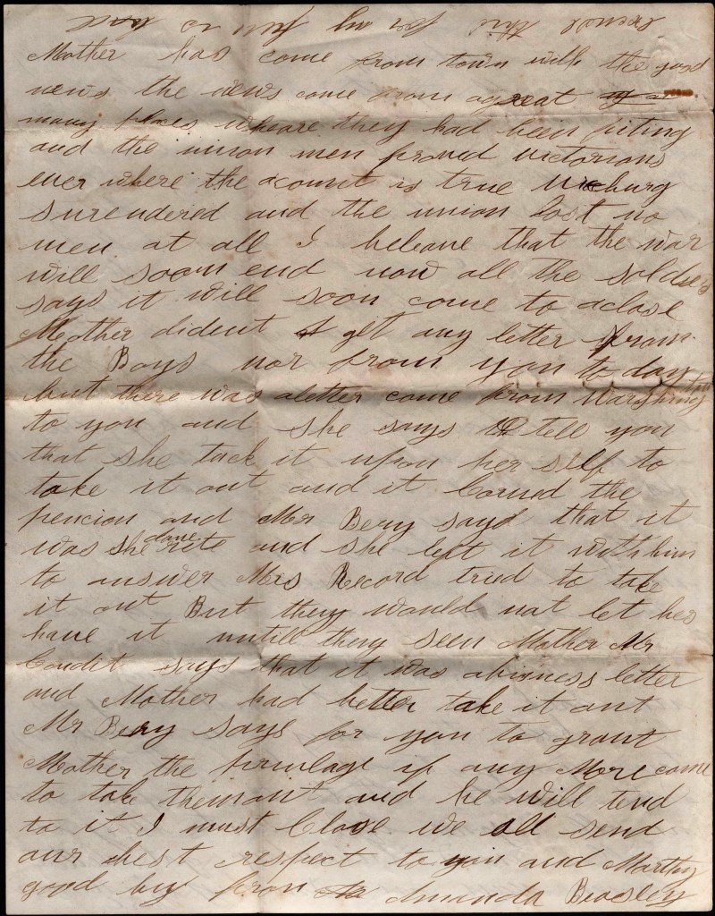 Mother has come from town with the good news. The news came from a great many places where they had been fighting and the Union men proved victorious everywhere. The account is true—Vicksburg surrendered and the Union lost no men at all. I believe that the war will soon end now. All the soldiers say it will soon come to a close. Mother didn’t get any letter from the Boys nor from you today but there was a letter came from Washington to you and she says to tell you that she took it upon herself to take it out and it contained the pension and Mr. Berry said that it was she done right and she left it with him to answer. Mrs. [Lucy] Record tried to take it out but they would not let her have it until they seen Mother. Mr. Condit says that it was a business letter and Mother had better take it out. Mr. Berry says for you to grant Mother the privilege if anymore come to take the money and he will tend to it.