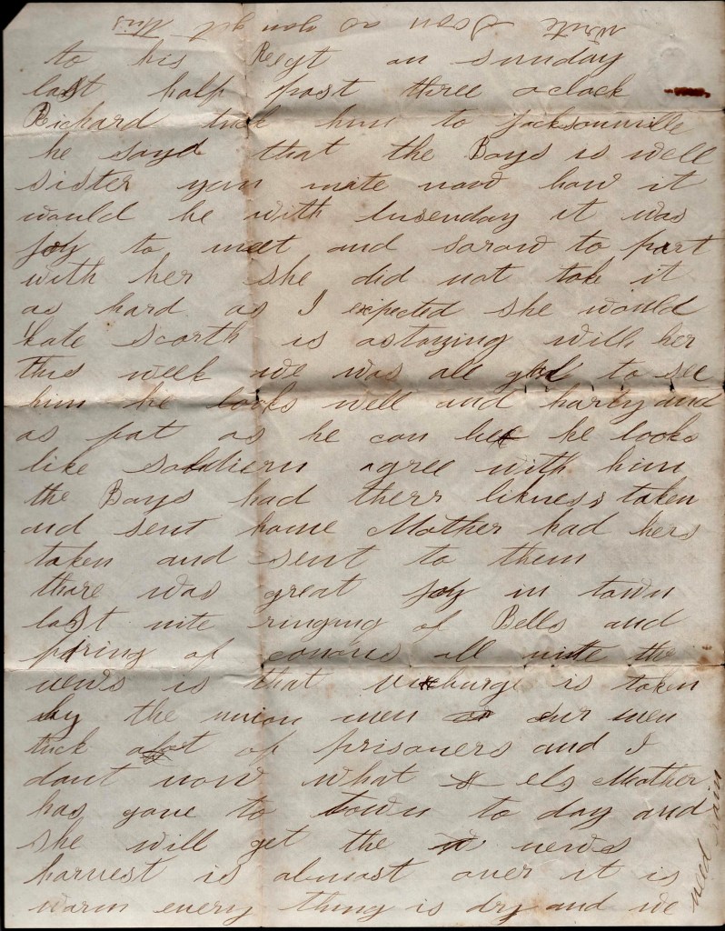 Lucinda has had the pleasure of seeing Peter’s face once more. Peter got a furlough for fifteen days and came home and stayed his time and then started back to his regiment on Sunday last [at] half past three o’clock. Richard took him to Jacksonville. He said that the Boys is well. Sister, you might know how it would be with Lucinda. It was joy to meet and sorrow to part with her. She did not take it as hard as I expected she would.