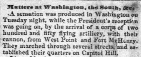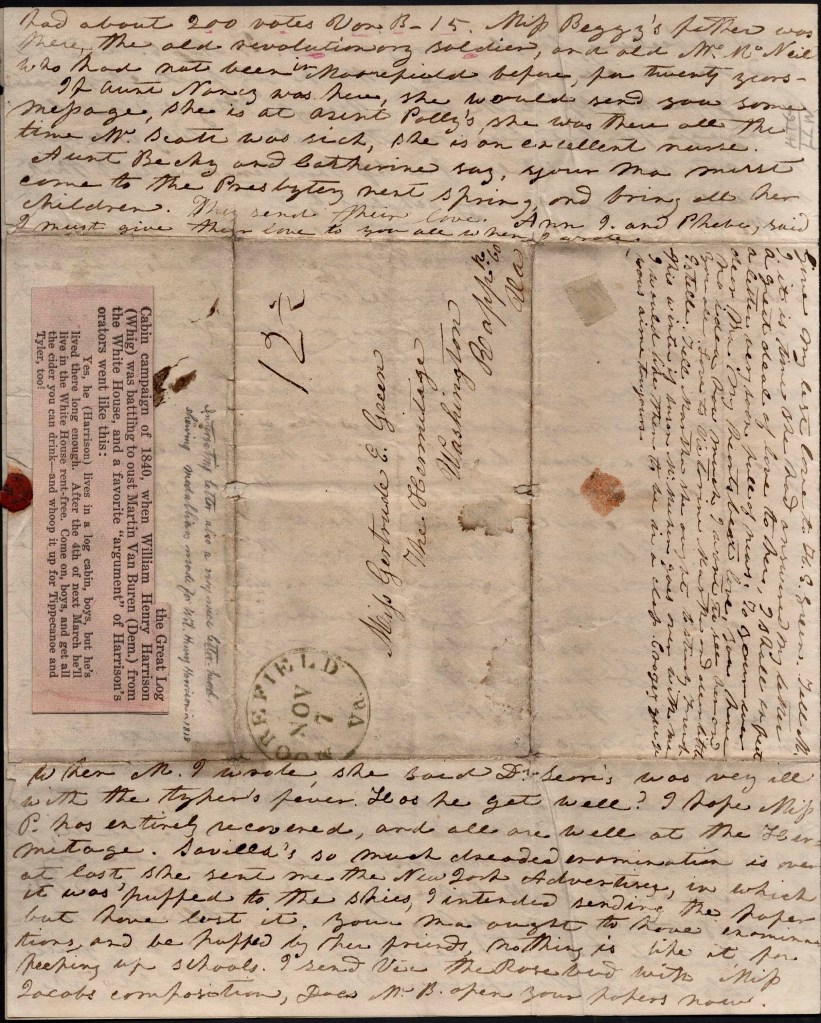 I went to the election Monday and though I thought very silly to break up the school for it, yet I had to do it as the scholars would have gone anyhow. M. and I, with John Machin & assistance, had the honor of raising one Whig banner. All the merchants had two or three hung out. It was quite a lively day in Moorefield. When I left, Old Tip had about 200 votes, Van Buren 15. Miss Beggz’s father was there, the old Revolutionary soldier, and old Mr. McNeil who had not been in Moorefield before for twenty years.