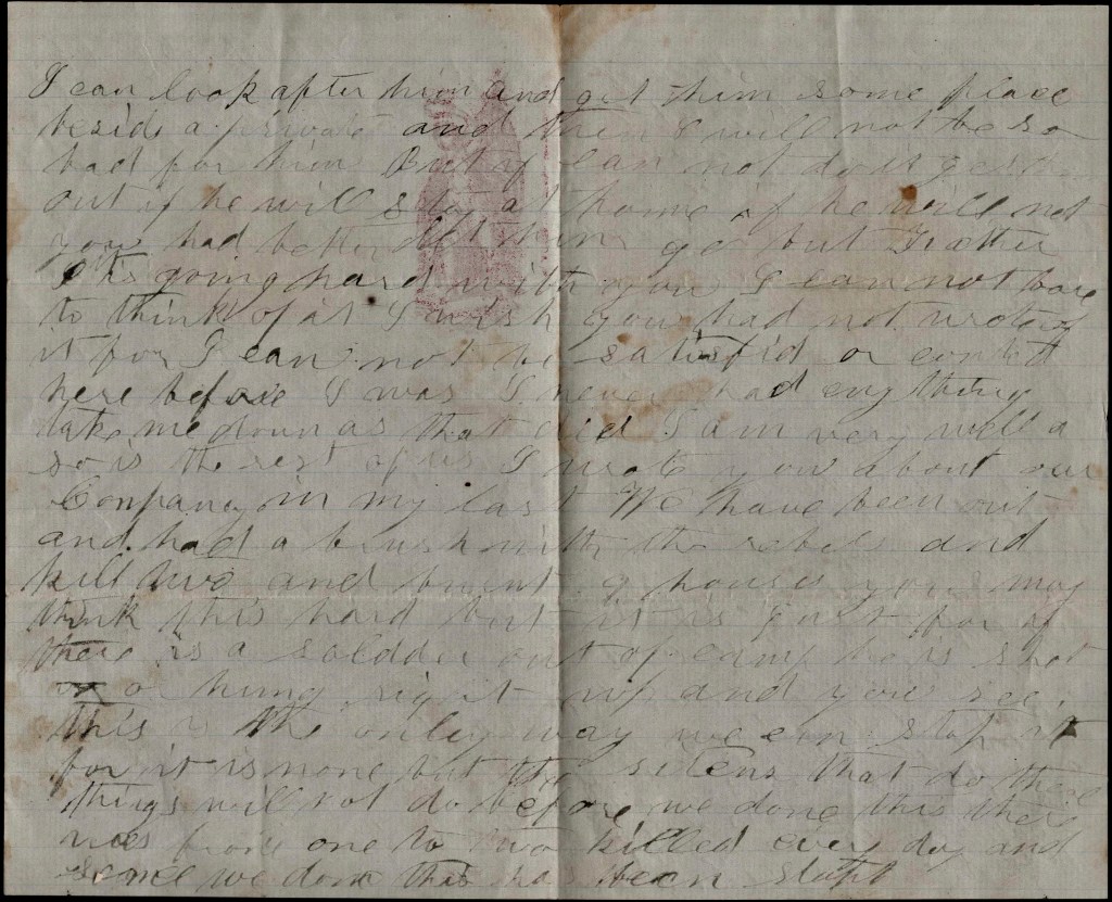 I am very well and so is the rest of us. I wrote you about our company in my last. We have been out and had a brush with the rebels and killed two and burnt nine houses. You may think this hard but it is just for if there is a soldier out of camp, he is shot or hung right up and you see this is the only way we can stop it for it is none but the citizens that do these things. Before we done this, there was from one to two killed every day and since we done this, it has been stopped.