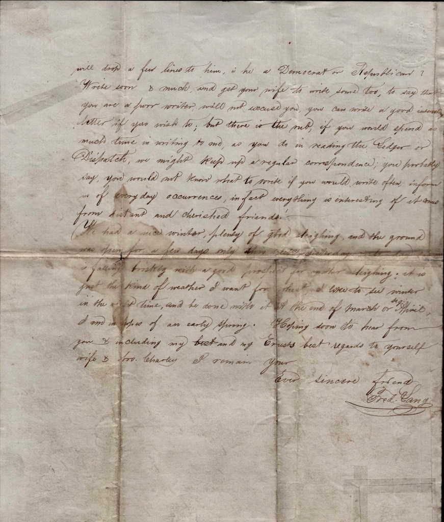 We had a nice winter—plenty of good sleighing, and the ground was open for only a few days this week. Yesterday & today it is falling briskly with a good prospect for another sleighing. It is just the kind of weather I want for wheat. I like to see winter in the right time and be done with it at the end of March or beginning of April. I am in hopes of an early Spring. Hoping soon to hear from you & including my best and my earnest best regards to yourself, wife and brother Charley, I remain your ever sincere friend, — Fred. Lang