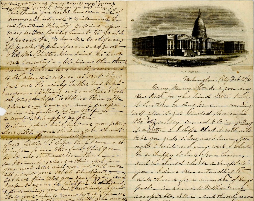 Many, many thinks to you my dear sister for your kind letter. Truly it has been a long time in coming “not after it got started, however.” This difficulty seemed to be in getting it written. I hope that it will not take you quite so long next time. You ought to write to me every week. I should be so happy to hear from home and it would also be a benefit to you. I have been intending to write home for a number of days past in answer to Mother’s very acceptable letter, and the only reason why I have not done so is, that I do not stay at home long enough to accomplish anything. you would really think that I was getting to be guide dissipated if I should tell you that the greater part of my time this winter had been spent at “the Capitol.”