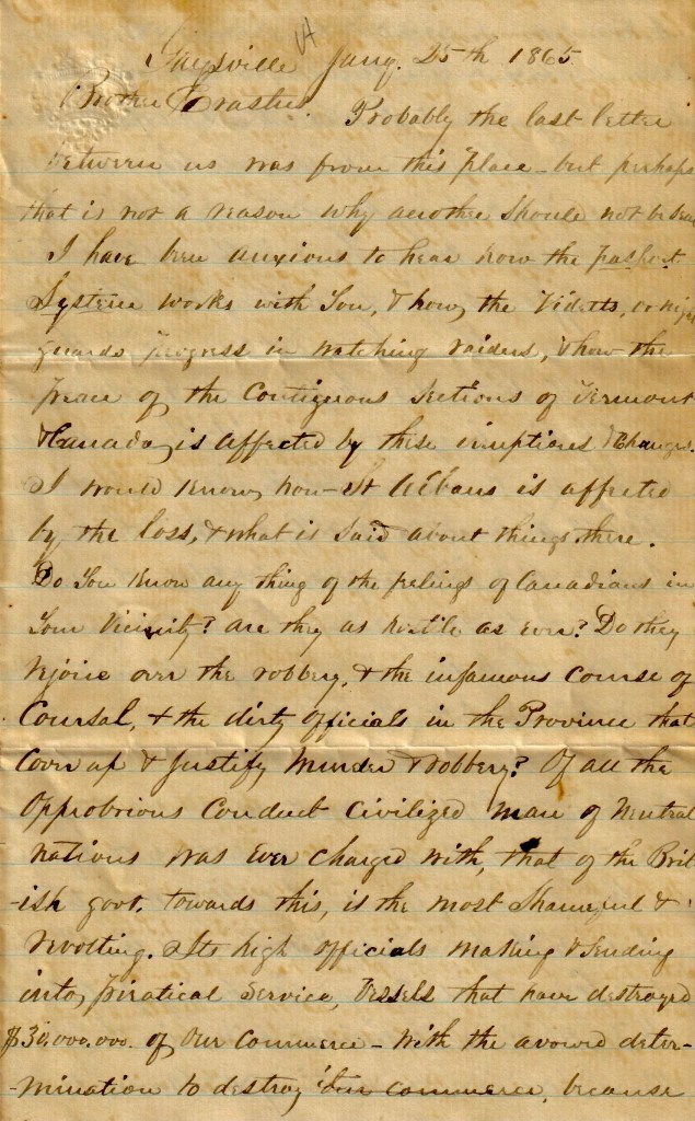 In his letter, Thomas expresses the outrage of Vermont citizenry with the notorious October 1864 Confederate raid on St. Albans and the Canadian government’s handling of the matter. The raid was conducted by 21 Confederate soldiers crossing into Vermont from Canada for the purpose of robbing banks to raise money for the Confederacy and to trick the Union army into diverting troops to defend their northern border against further raids. They got the money, killed a local, and escaped back to Canada with apparent impunity. As an unintended consequence, the raid served to turn many Canadians against the Confederacy since they felt that Canada was being drawn into the conflict without its consent.