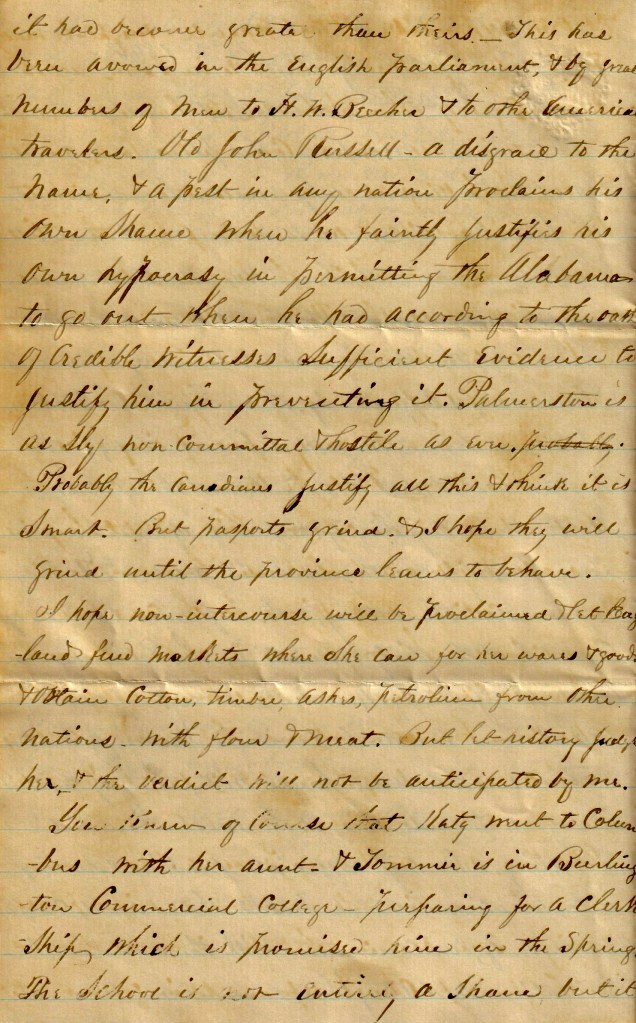 Old John Russell—a disgrace to the name and a pest in any nation—proclaims his own shame when he faintly justifies his own hypocrisy in permitting the Alabama to go out when he had according to oath of credible witnesses sufficient evidence to justify him in preventing it. Palmerston is as sly noncommittal & hostile as ever. Probably the Canadians justify all this & think it is smart. But passports grind & I hope they will grind until the province learns to behave.