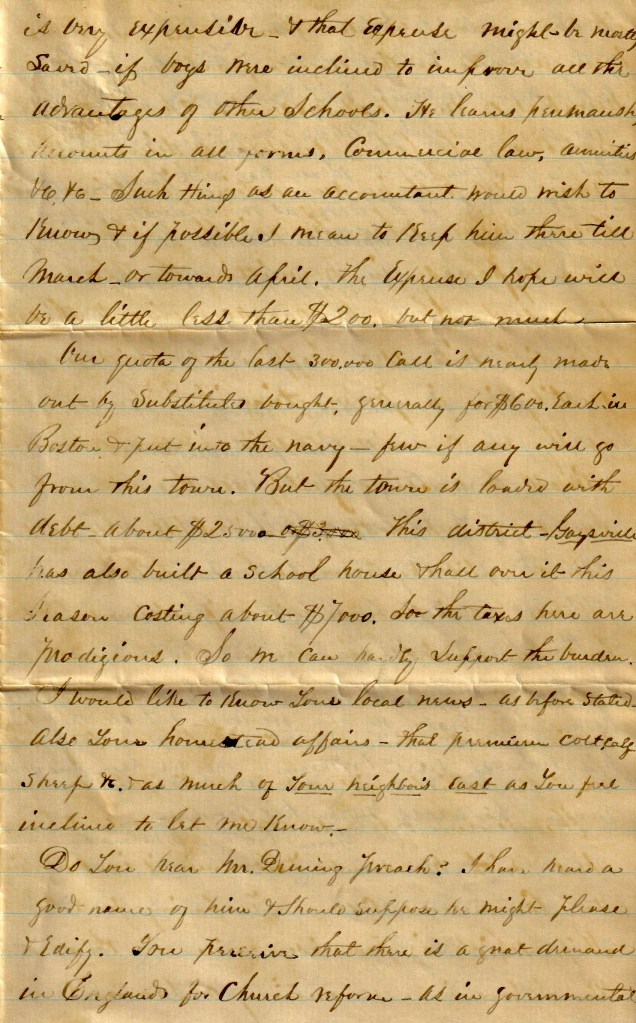 Our quota of the last 300,000 call is nearly made out by substitutes bought, generally for $600 each in Boston & put into the Navy. Few if any will go from this town. But the town is loaded with debt—about $25,000. This district—Gaysville—has also built a school house, shall own it this season, costing about $7,000. So the taxes here are prodigious. So we can hardly support the burden.