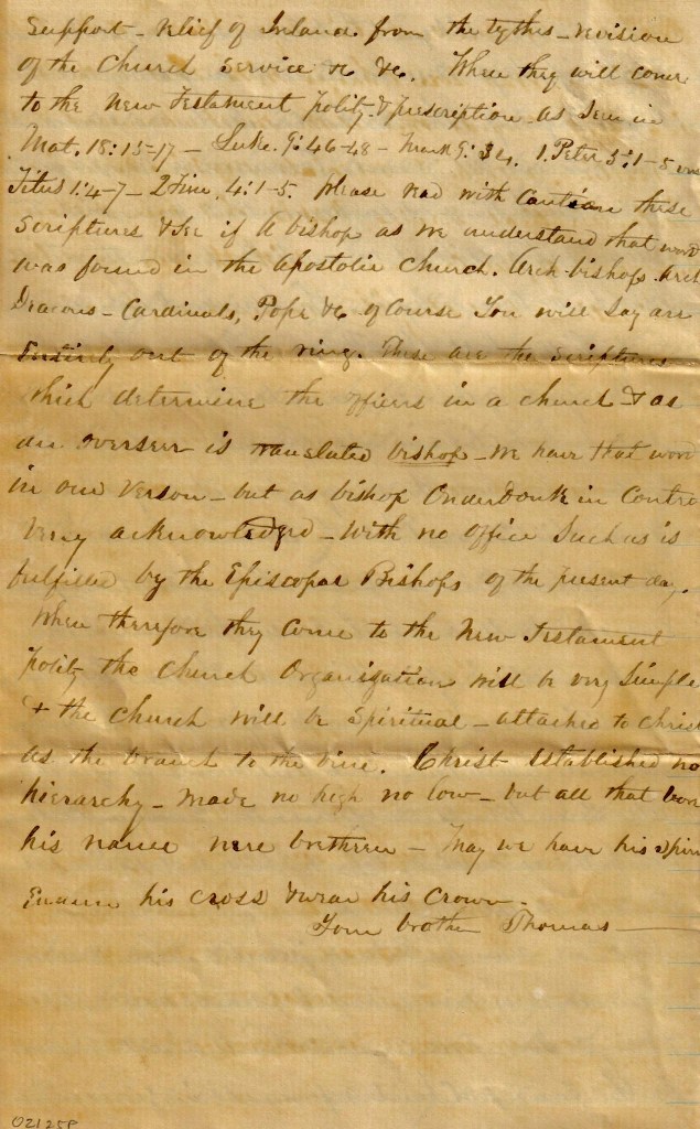 Do you hear Mr. Deming preach? I have heard a good name of him & should suppose he might please & edify. You perceive that there is a great demand in England for Church reform—as in governmental support—relief of Ireland from the tithes—revision of the church service, &c. &c. Where they will cover to the New Testament polity & prescription as seen in Mat. 18:15-17, Luke 9:46-48, Mark 9:34, 1 Peter 5:1-5, Titus 1:4-7, and 2 Fin 5:1-6/ Please read with caution these scriptures and see if a bishop as we understand that work was found in the Apostolic Church. Arch. Bishops, Arch Deacons, Cardinals, Pope, &c of course you will say are entirely out of the ring. These are the scriptures which determine the officers in a church & as an overseer is translated bishop. We hear that word in our version—but as Bishop Onderdonk in controversy acknowledged—with no office such as is fulfilled by the Episcopal Bishops of the present day. Where therefore they come to the New Testament polity the church organization will be very simple & the church will be spiritual—attached to Christ as the branch to the vine. Christ established this heirachy—made no high no low—but all that bore his name were brethren. May we hear his spirit, endure his cross, & wear his crown.