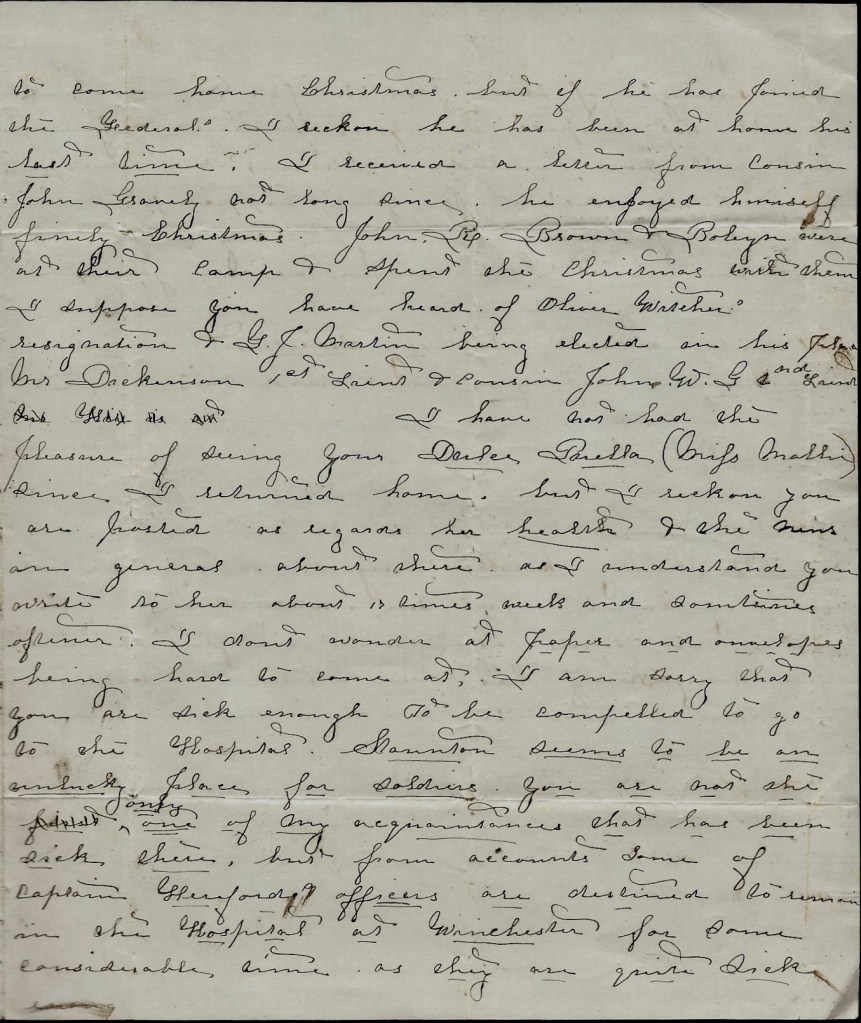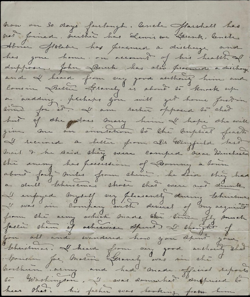 I received a letter from Dr. Wingfield last mail & he said they were camped near Winchester. The enemy has possession of Romney—a town about forty miles from them. He said they had a dull Christmas, those that were not drunk. I enjoyed myself very pleasantly during Christmas. I was in company with several of my acquaintance from the army which made the time fly much faster than if otherwise spent. I thought of you all and wondered how you spent your Christmas.