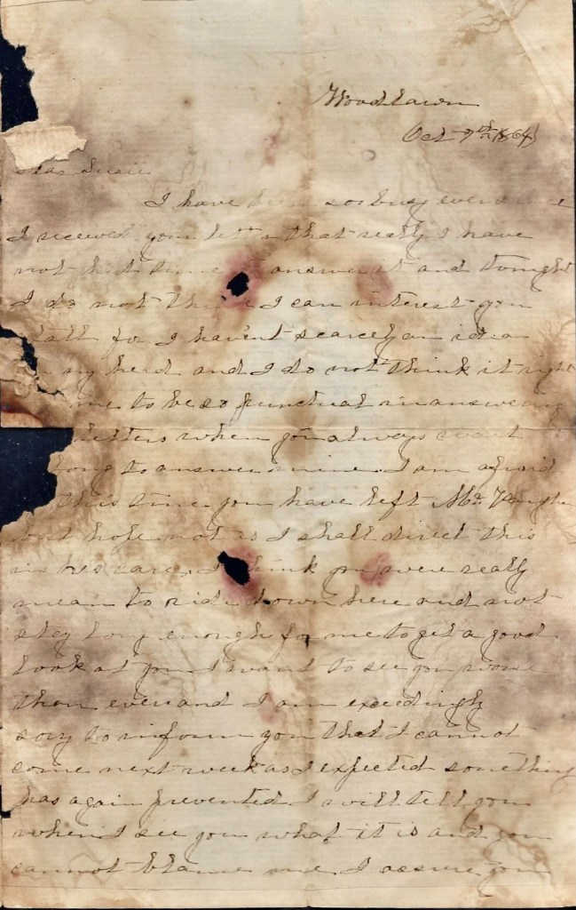 I have been so busy ever since I received your letter that really I have not had time to answer it and tonight I do not think I can interest you at all for I haven’t scarcely an idea in my head and I do not think it right [for] me to be so punctual in answering [your] letters when you always wait [so] long to answer mine. I am afraid this time you have left Mr. Vaughan but hope not as I shall direct this in his care. I think you were really mean to ride down here and not stay long enough for me to get a good look at you. I want to see you worse than ever and I am exceedingly sorry to inform you that I cannot come next week as I expect something has again prevented. I will tell you when I see you what it is and you cannot blame me. I assure you, I will be very much disappointed not coming, but I will try to come in a few weeks. I cannot set any time.