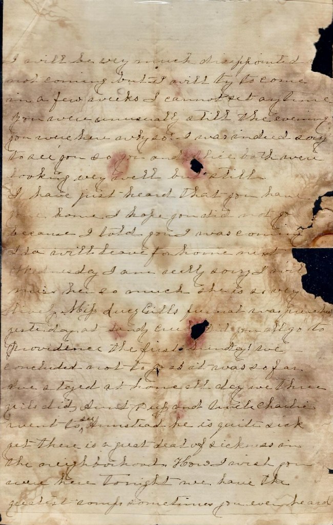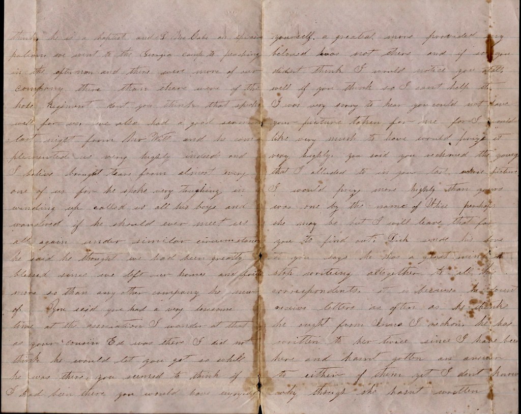 You were unusually still the evening you were here. Why so? I was indeed sorry to see you so. You and Alice both were looking very well but still I have just heard that you have gone home. I hope you did not go because I told you I was coming. Ida will leave for home next Wednesday. I am really sorry. I will miss her so much. She is so very lively. Miss Lucy Gills’ funeral was preached yesterday at Sandy Creek. Did you all go to Providence the first Sunday? We concluded not to go as it was so far. We stayed at home all day—we three girls did. Aunt Duss and Uncle Charlie went to see Armistead. He is quite sick yet. There is a great deal of sickness in the neighborhood.
