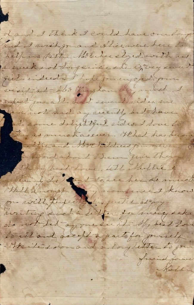 How I wish you were here tonight. We have the greatest romps sometimes you ever heard of and I think I could have one longer and I wish you and Alice were here to help us. Pattie McGehee stayed with us a week not long since. She is a very sweet girl indeed. I hope you enjoyed your visit at Mr. Vaughan very much. I expect you all had several rides. We had not had any recently but have had some delightful rides. I have to ride as much as ever. What has become of Mollie and Mr. Childress? You never said a word about them. Give them both my very best love. Tell Mollie I certainly do want to see her so much.