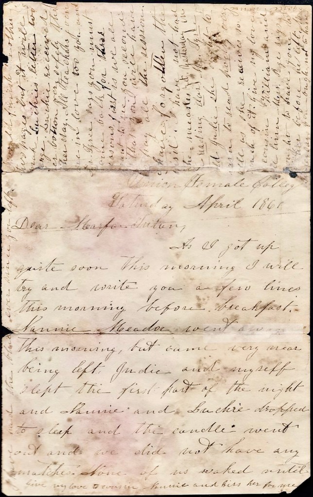 As you may so soon have to leave home, I will address this letter to you. We reached Farmville very safely after a pleasant trip. Old Mrs. French, mother of Mrs. Powers, came down with us. One of her granddaughters (Miss Woodson) came in with her. Mrs. Loomis, daughter of Mrs. Sam Hobson came also. After we got to Farmville, several Tennessee soldiers came out of the cars. A good many girls and gentlemen had collected at the Depot. The girls threw bouquets to the soldiers. One of them (the soldiers) made a nice little speech in return for the flowers. Mrs. Loomis said he was an Editor and a very nice gentleman. She came to Virginia under his care. One of the soldiers proposed three cheers for the Virginia girls and they were cheered in style. 2