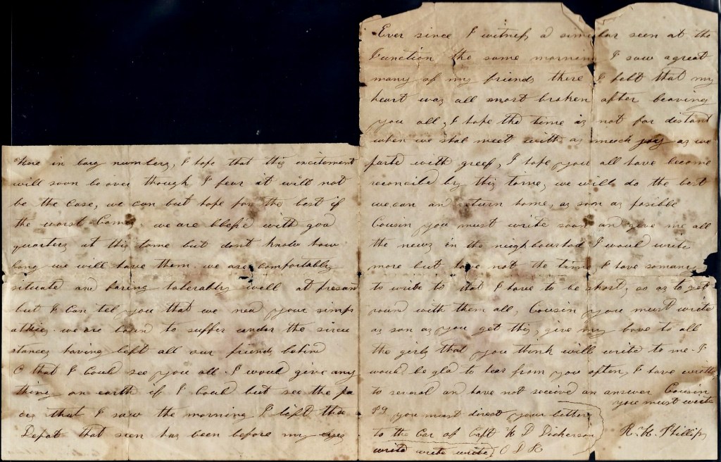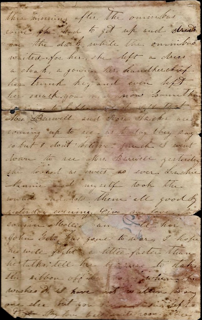 Cousin M. said she thought you were coming home to see her. Says she thinks you all might come down once [ ] at least. My bonnet is very much adored down here. They say it is the prettiest one in the neighborhood. Write to me soon as you get this and all the news. Tell Mary and sister to write also. How is Aunt Lou Overton? All send love. My love to Mother and Mary and tell Mary she must write. I must close as I am in a hurry. My love to Beck Farley and all hers. I saw Mrs. Gills and Bettie Sunday. They were well. I haven’t been anywhere since I have been here, as I am so closely confined now, but I hope it will not be so long, for I hope cousin will be well soon. Have you all had beets and potatoes? We have them every day and chicken all the time. Mr. Whitlock says he thinks I will make a very good housekeeper. They broke into his smoke house not long [ago] and took three or four hundred pounds of meat and some ice.