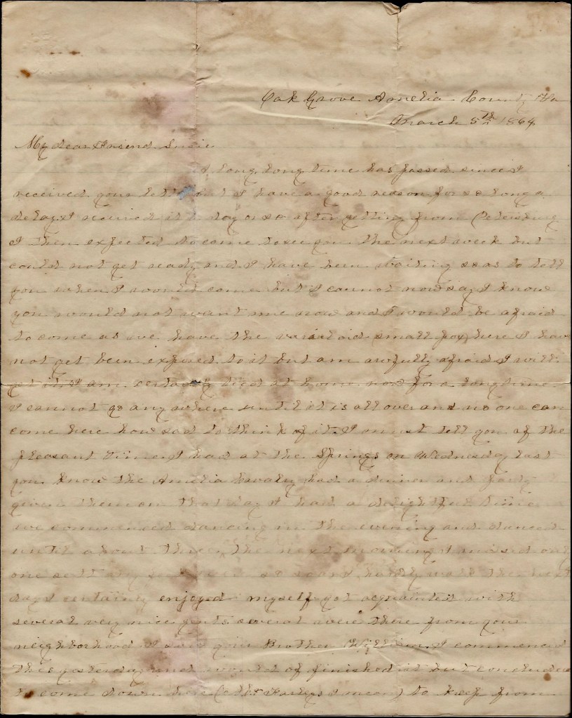 A long, long time has passed since I received your letter but I have a good reason for so long a delay. I received it a day or so after getting from Petersburg. I then expected to come to see you the next week but could not get ready and I have been waiting so as to tell you when I now can come, but I cannot now say I know. You would not want me now and I would be afraid to come as we have the variola small pox here. I have not yet been exposed to it but am awfully afraid I will get it. I am currently tied at home now for a long time. I cannot go anywhere until it it all over and no one can come here. How sad to think of it. I must tell you of the pleasant time I had at the Springs on Wednesday last. You know the Amelia Cavalry had a dinner and party given them on that day. I had a delightful time. We commenced dancing in the evening and danced until about three the next morning. I missed only one set & I could hardly walk the next day. I certainly enjoyed myself. Got acquainted with several very nice gents. Several were there from your neighborhood. I saw your Brother William [Confederate Surgeon].