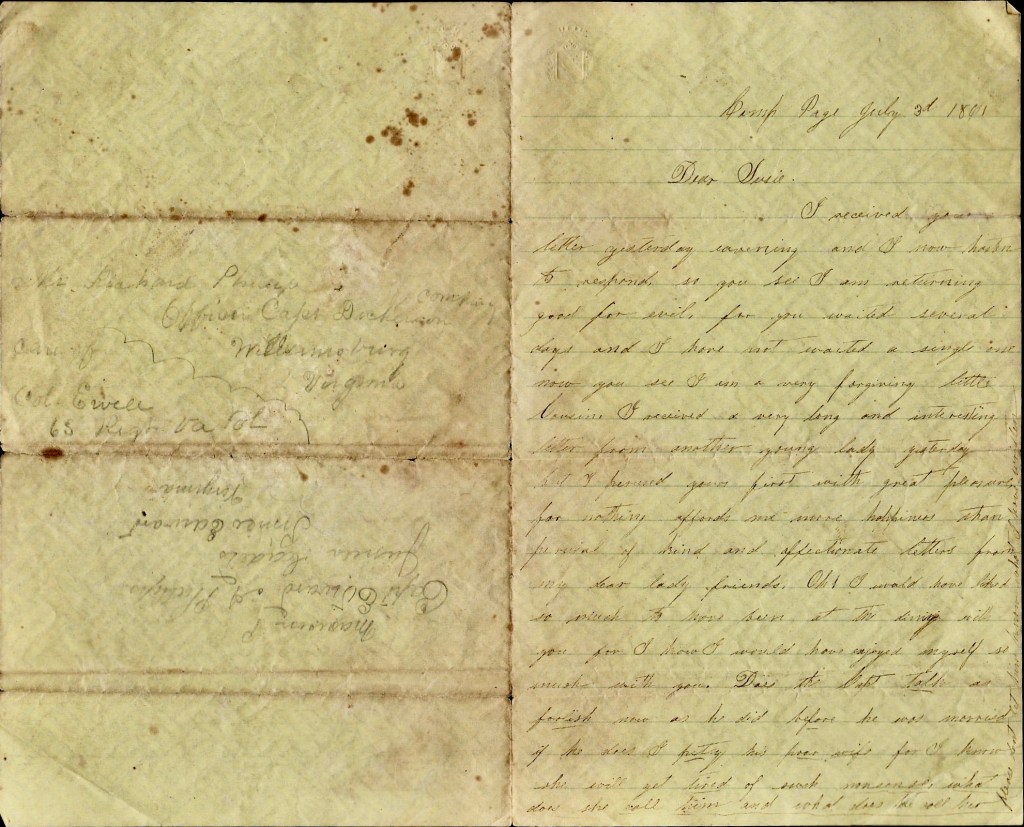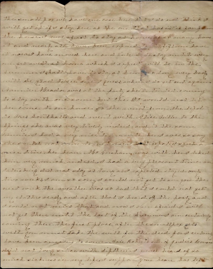 Had a very pleasant time in Petersburg. Did not stay as long as I expected. Stayed only two weeks. I am so sorry I could not get to see you. The next week the weather was so bad that I could not get my clothes ready and after that I heard of the party and I could not miss that and now I am afraid I will not get there until the last of Summer. I am certainly coming there the first place after the small pox gets well. You must take the will for the deed for I certainly have been anxious to come. Annie Roberts, one of Judie’s cousins died not long since with diphtheria. I never heard of so much sickness in my life. I suppose your beau has left for the war. I saw him at the Springs. He did not stay to the party. Said he had to leave the next morning. What a pity it was. After frolicking all night, some of them were looking very serious. Others enjoyed themselves as much as possible. I wish they could have stayed a second week or too longer. Their furlough was not out until the fifteenth but the Yankees were advancing so fast they were called back. The city battalion acted very badly & surrendered. The say everyone run like anything. If I were you I would advise my beau to leave that company and join some other. I heard it from good authority. Give me a cavalryman, but no doubt some of them have run too.