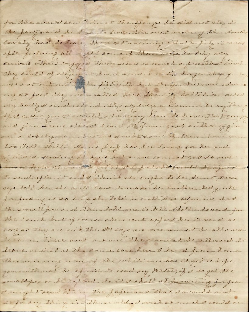 Tell Mollie [that] Aunt Duss has her lamb for her and intended sending it by us but as we cannot go, I do not know how she can get it. I expect she would be afraid to send after it and I think she ought to be. Aunt Duss says tell her she will have to make her another bed quilt for feeding it so long. She told me all this before we had the small pox and then told me to tell Mollie to send for the lamb but of course she won’t expect her to send as long as they are sick. The Dr. says no one must be allowed to come there and no must be allowed to leave and it is the same case here. I heard from home this morning. None of the white ones has it yet. I hope you will not be afraid to read my letters. If I do get the small pox or be exposed to it, I shall stop writing for fear I might send it in the paper, and that I would not do for anything in the world. I wish so much I could see you. There are so many things I can’t tell you that I cannot write. But I expect I shall forget all before I see you.