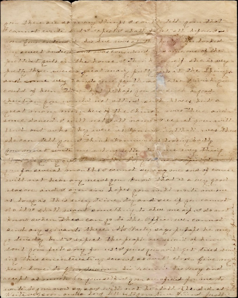 Your intended sis Sue was at the party. She looked very sweet indeed and was considered as one of the prettiest girls in the house. I think myself she is very pretty. There were a great many pretty girls at the Springs and some very handsome gentlemen also. I wish you could have been there but perhaps you are such a good Christian you would not attend such places. But a great many members of the church was there and some danced. I will not call names. I expect you will find out who they were as Fannie Walthall was there. She can tell you. Fannie was looking badly.