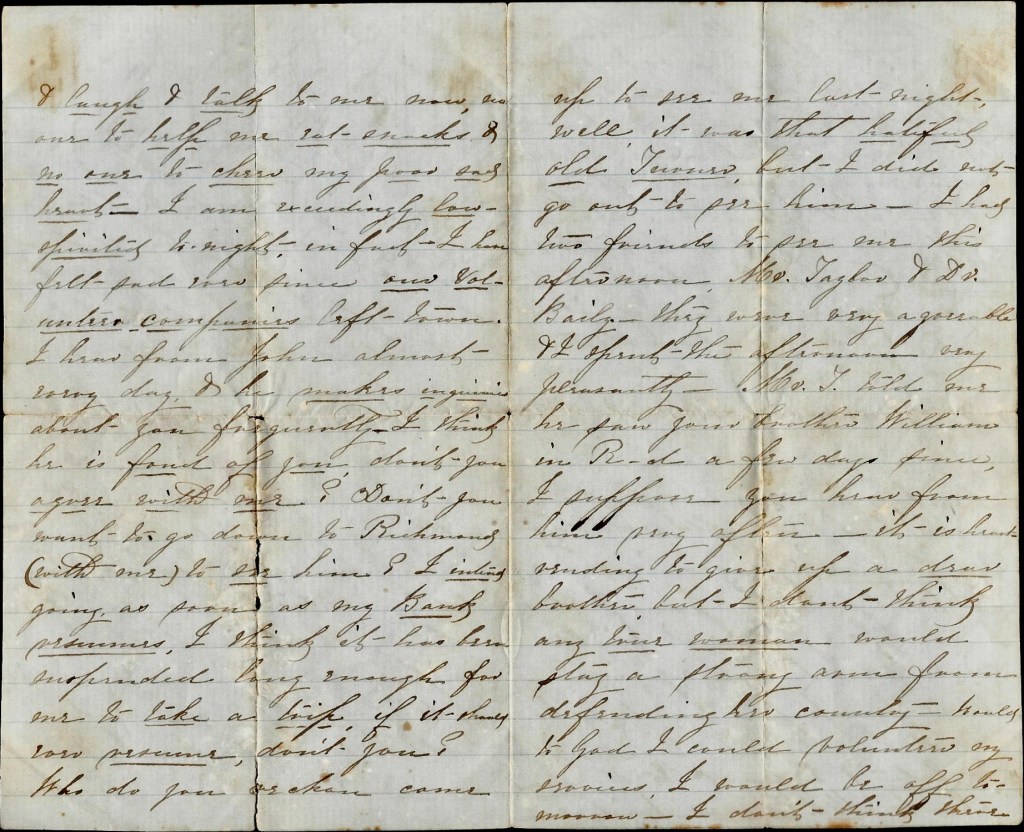 Willie went with Mr. Brown Saturday to drill. He drilled one squad. He says they drilled pretty well. A few members of the Powhatan Troop have returned to visit their friends. They say Mr. [Philip St. George] Cocke wants more persons in his troop. I understand he authorized Mr. Murray to get new members. They say Mr. Cocke is very kind and furnishes them with many comforts. Some of them spoke of sending for money. He told them that was unnecessary—he would furnish it to them. That if they would spend their money right, he would not mind letting them have what they wanted. It is quite convenient to have a Colonel who is able to supply the wants of his men.