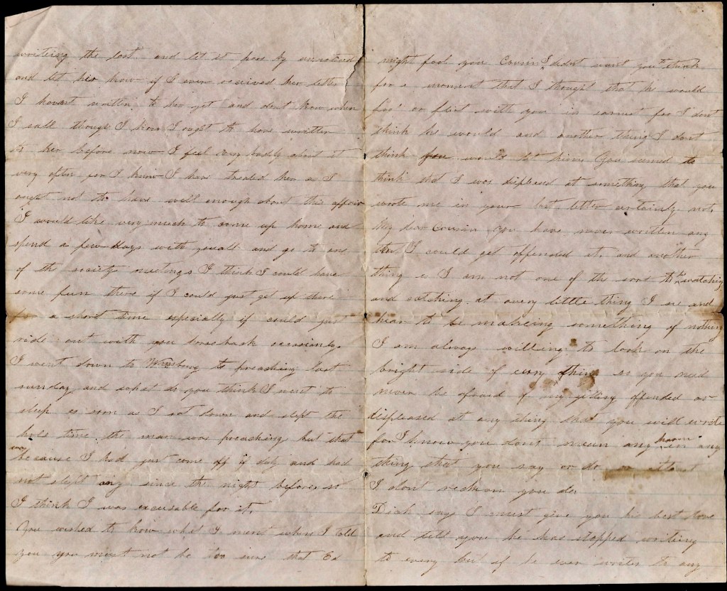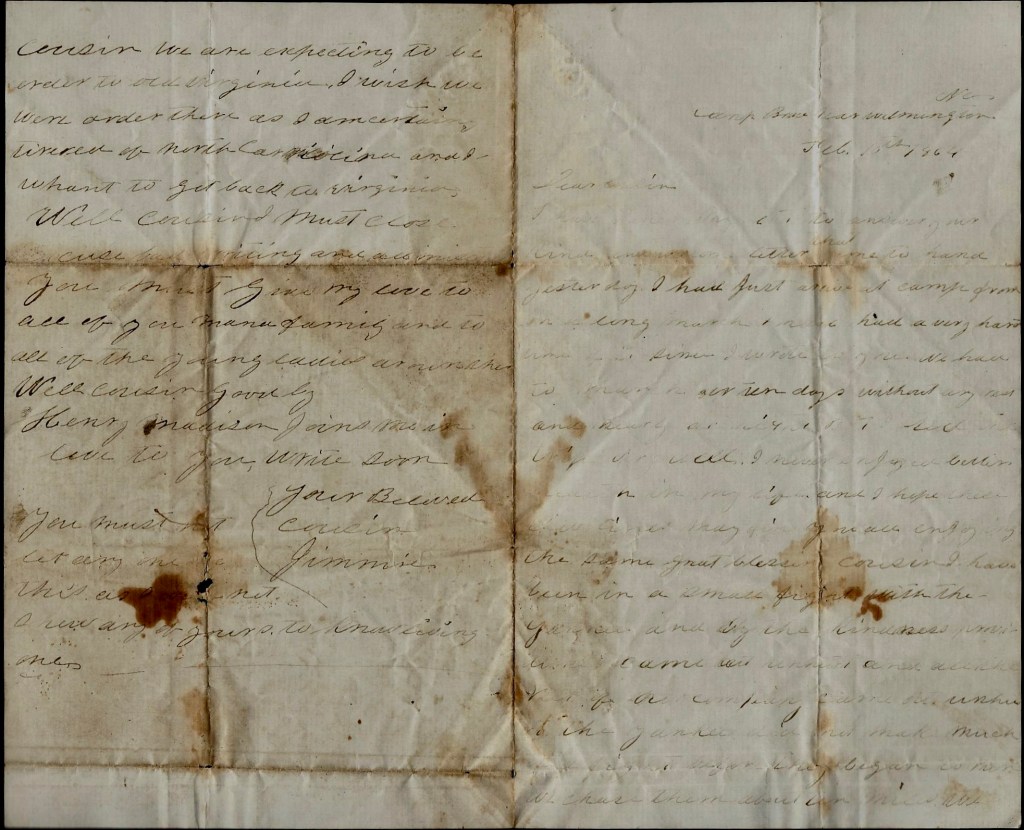 Well, cousin, I must close. Excuse bad writing and all mistakes. You must give my love to all of your Mam’s family and to all of the young ladies around there. Well, cousin, goodbye. Henry Madison joins me in love to you. Write soon. Your beloved cousin, — Jimmie [Overton]