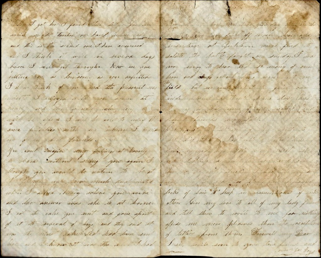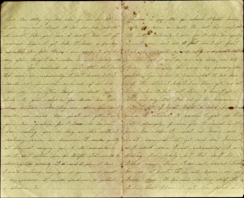 He sends Matty fifty kisses which he say you must deliver and that you must not let Clayton forget him. Lucy is very much interested in the sewing society. She has attended both of the meetings since you left. I believe they are doing very well. Mrs. McDaniel makes an energetic president. The Bolleny’s are doing much better now than at first. I saw the Doctor today and he told me he had htirteen sick soldiers staying with him. This is doing his duty bravely as all should whether in the army or out of it. I should like very much to send you some of Frank’s letters. He gives a very interesting and graphic description of camp life, but [sister] Charlotte I reckon would start down after it even if she could be prevailed on to part with it for a short time. She has been reading them aloud for the second time and commenting on them ever since I have been writing which must be my apology for this badly written and unconnected epistle.