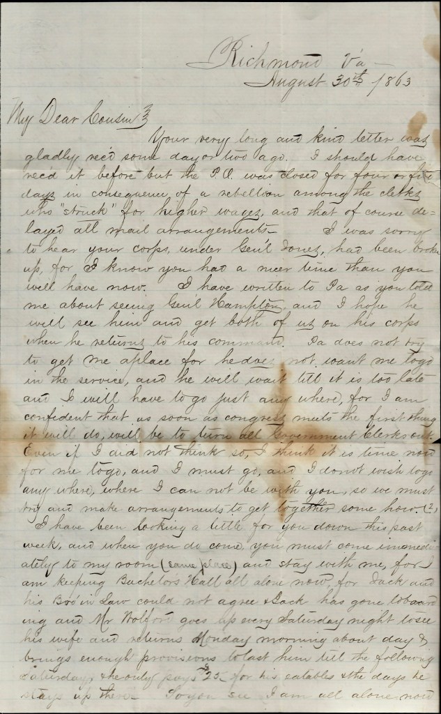 I was sorry to hear your corps, under Gen’l Jones, had been broken up, for I know you had a nicer time than you will have now. I have written to Pa as you told me about seeing Gen’l Hampton and I hope he will see him and get both of us on his corps when he returns to his command. Pa does not try to get me a place for he does not want me to go in the service, and he will wait till it is too late and I will have to go just any where, for I am confident that as soon as Congress meets, the first thing it will do will be to turn all Government Clerks out. Even if I did not think so, I think it is time now for me to go, and I must go, and I don’t wish to go any where, where I cannot be with you. So we must try and make arrangements to get together somehow.