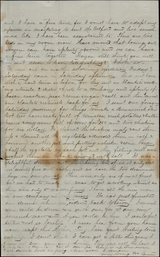 Do you still think you will be sent down to learn telegraphing? I hope so. We were out on another soldering expedition Friday & Saturday. Came in Saturday afternoon. Did not have such a hard time as before, for they sent us blankets, cooking utensils, 3 skillets & 2 pots to a company and aplenty of bacon, crackers, peas & some sugar & salt and then carried our blankets & utensils back for us. I went out foraging Saturday morning for things to make a Brunswick stew. Got two haversacks full of tomatoes, irish potatoes & butter beans & my arms full of corn for $1.50 and two chickens for six dollars. We cleaned the chickens nicely & cut them up & cleaned all the vegetables & divided them in half & borrowed another pot, and putting a chicken & some bacon & half the vegetables in each pot, and then filling with water, we put them on to boil, seasoned with salt. It was a delightful dinner and there being ten of us, it only cost us seventy five cents each, and we have the two drummer boys in our mess. There were only six of us at first but we had to make ten so as to get a cooking utensil as there were only 5 to a company. I have all the nice men in our company in my mess. We had just finished our dinner when we were ordered back to town.