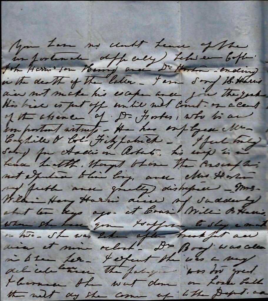 You have no doubt heard of the unfortunate difficulty between Capt. John Harris’s son Henry and Dr. Horton ending in the death of the latter. I am sorry Henry Harris did not make his escape and join the Yankees. His trial is put off until next court on account of the absence of Dr. Forbes who is an important witness. He has employed Mr. Coghill & Col. Fitzpatrick. I feel truly sorry for Addison Roberts. His wife is in bad health—thought to have the consumption, not expected to live long—and Mrs. Horton very feeble and greatly distressed.