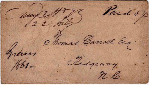 Addressed to Thomas Carroll, Esq., Ridgeway, North Carolina