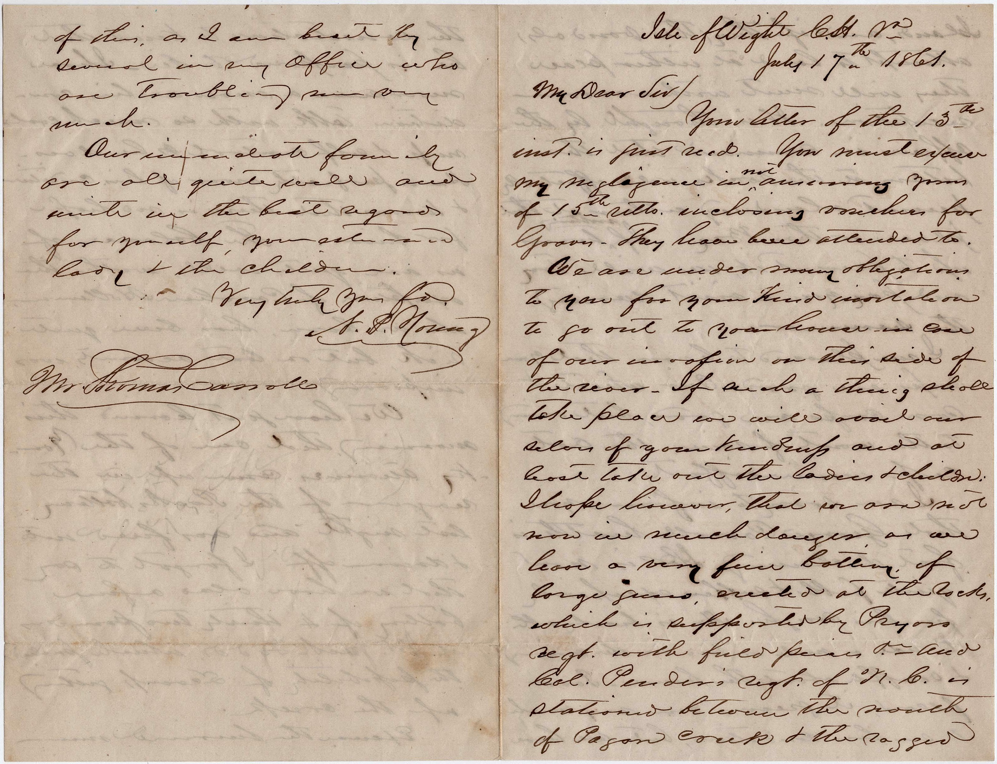 We are under many obligations to you for your kind invitation to go out to your house in case of our invasion on this side of the river. If such a thing shall take place we will avail ourselves of your kindness and at least take out the ladies & childrren. I hope, however, that we are not now in much danger as we leave a very fine battery of large guns erected at the rocks which is supported by Pryor’s Regiment with field pieces &c. and Col. Pender’s Regiment of North Carolina is stationed between the mouth of Pagan Creek 1 & the ragged Islands, and if they (the vandals) attempt to land at either place they will meet with a warm reception. It is thought by the officers in command that the battery at the rocks will effectually prevent a landing either at that place or the Bay.