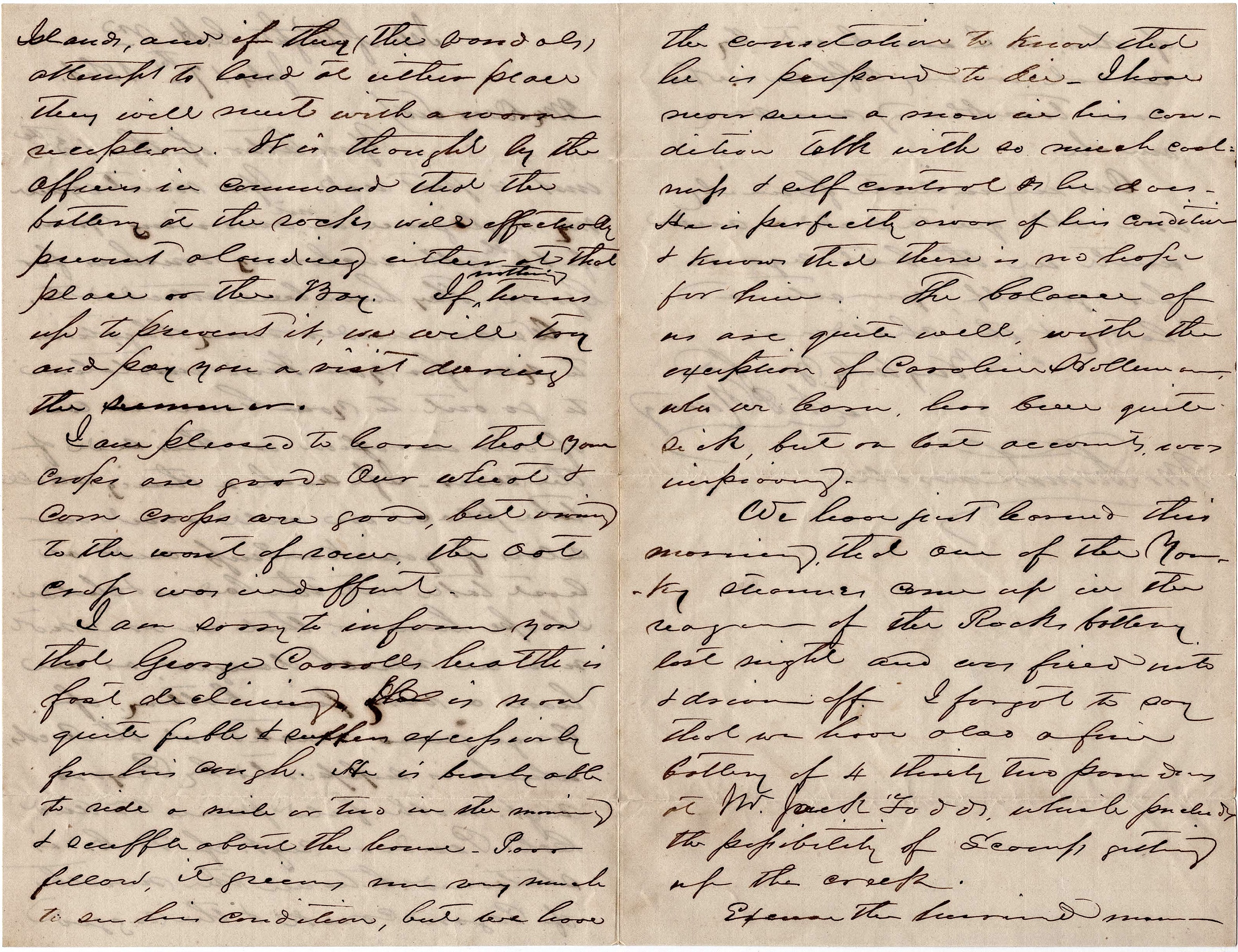 I am sorry to inform you that George Carroll’s health is fast declining. He is now quite feeble & suffers excessively from his cough. He is barely able to ride a mile or two in the morning & shuffle about the house. Poor fellow. It grieves me very much to see his condition but we have the consolation to know that he is prepared to die. I have never seen a man in his condition talk with so much coolness & self control as he does. He is perfectly aware of his condition & knows that there is no hope for him. The balance of us are quite well with the exception of Caroline Holleman who we learn has been quite sick, but on last accounts, was improving.