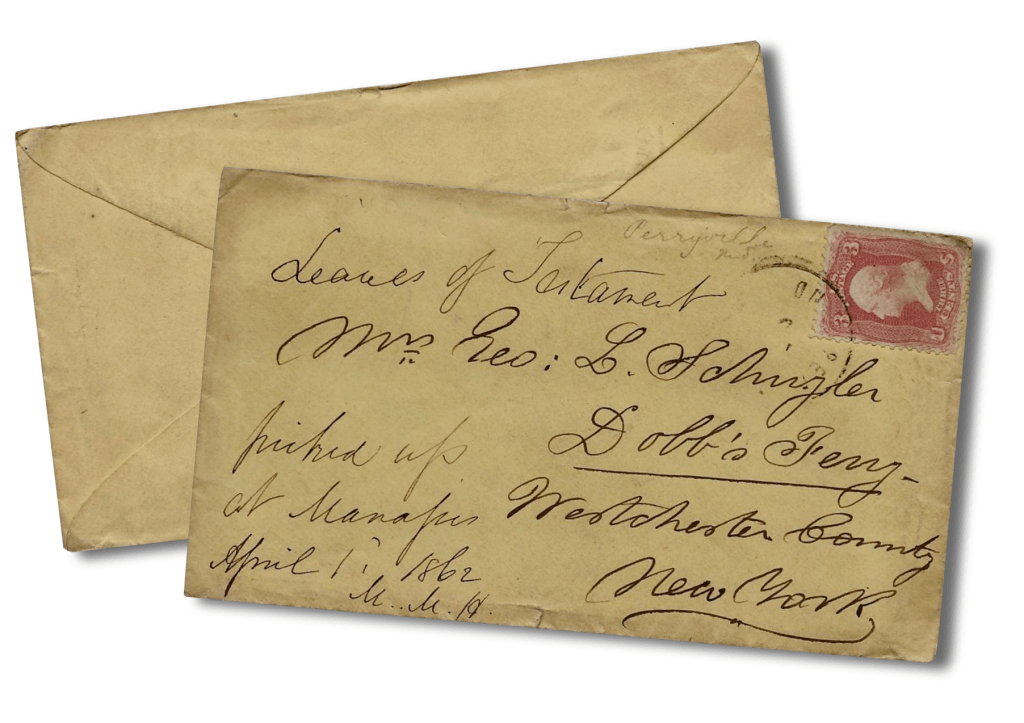 “Leaves of Testament picked up at Manassas, April 1, 1862, M. M. H.
