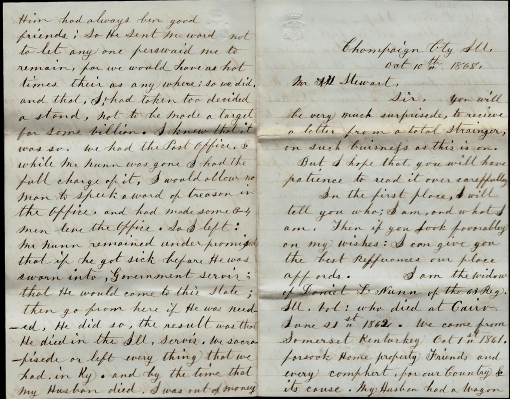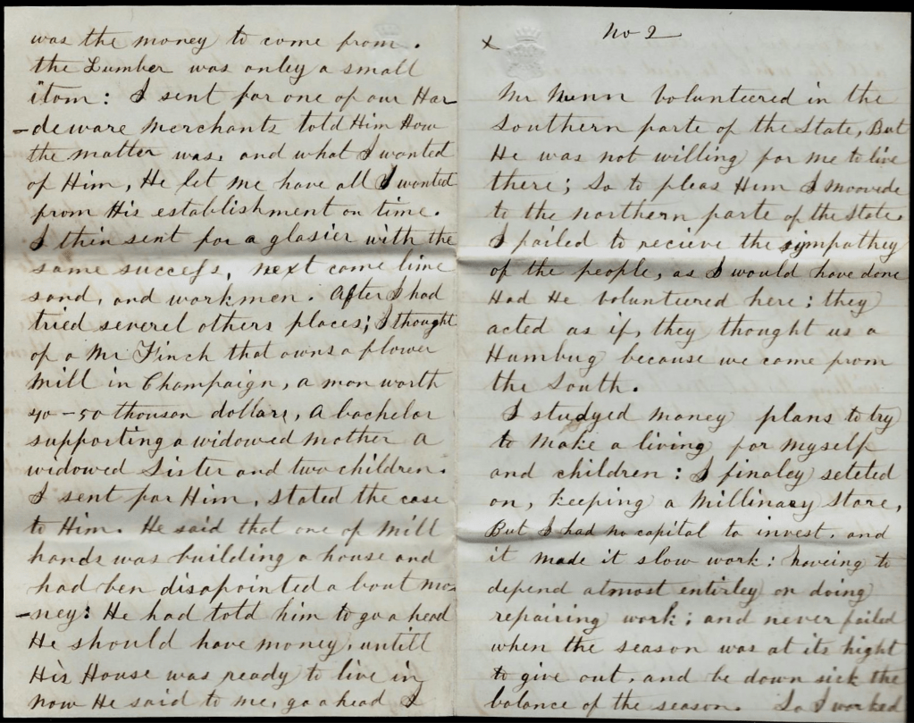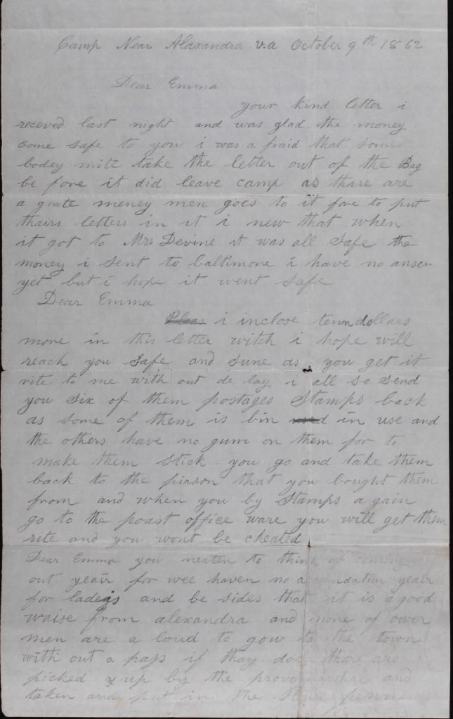 Dear Emma, I am very much obliged to you for sending me the silk and needles, Also the stamps and paper for I hadn’t none for to write on. Give my love to Josephine. Tell her that in 48 hours after the pay master comes, she will receive it. We are expecting him every day now.