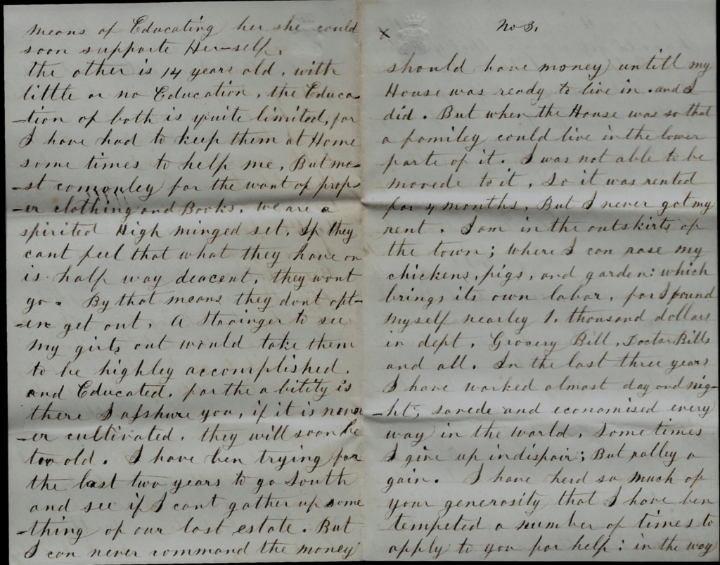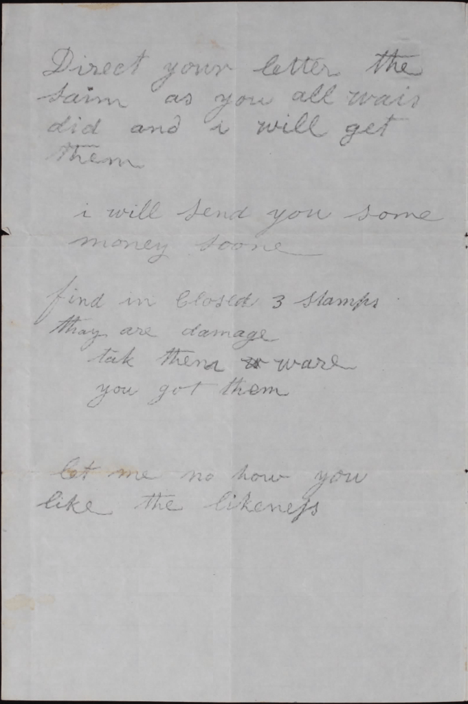 Please send me three envelopes as I haven’t got none. I have paper. Direct your letter as before.