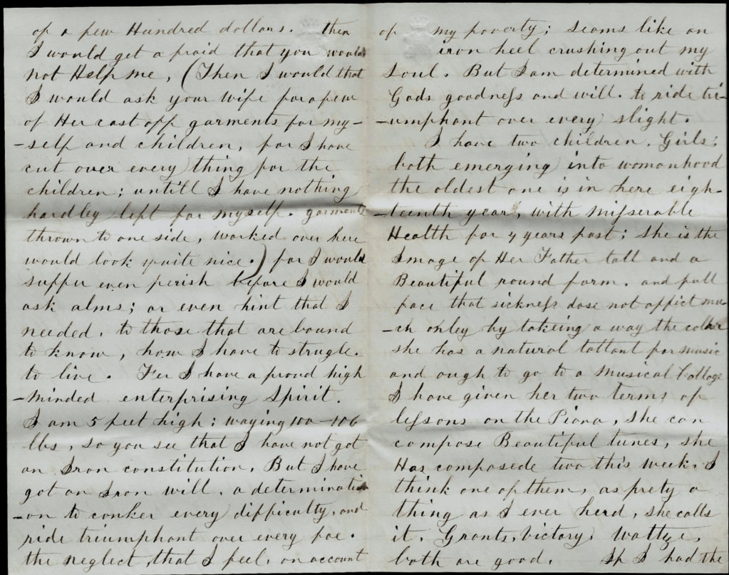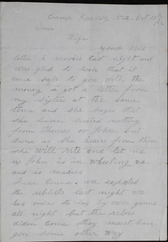Your kind letter I received last night and was glad to hear that it came safe to you with the money. I got a letter from my sister at the same time and she says that she hasn’t heard nothing from Thomas or John but soon as she hears from them she will write and let me know. John is in Wheeling, Virginia, and is married.
