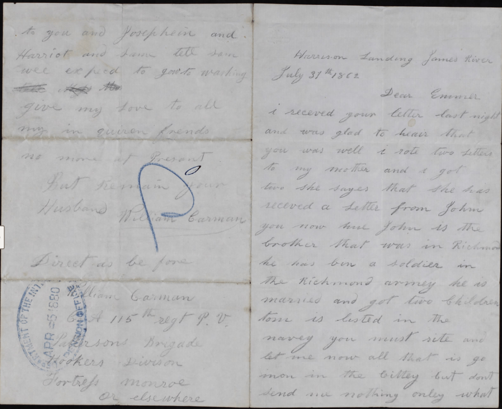 Direct your letter to me, William Carman, Co. A, 115th Regt. P. V., Patterson’s Brigade, Washington D. C. , or elsewhere.